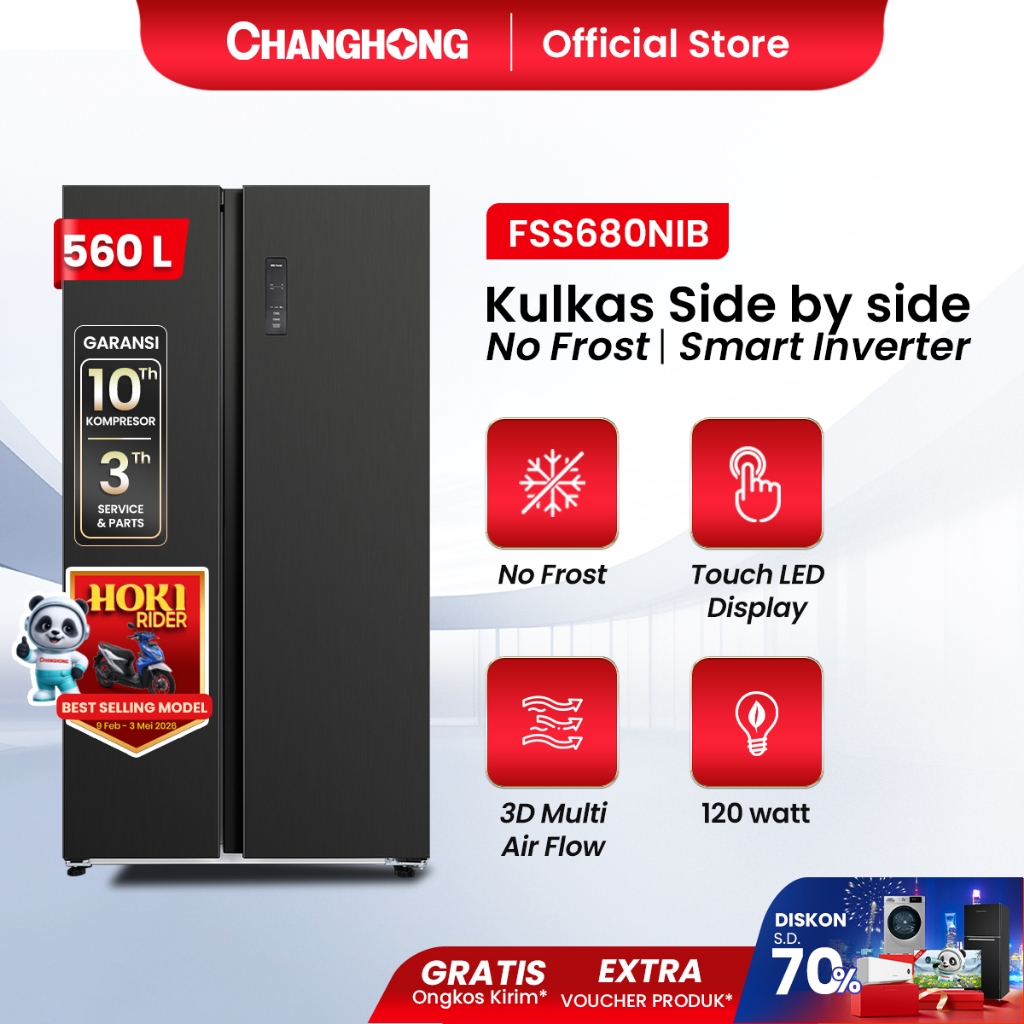 [BIG DEALS] CHANGHONG Kulkas 2 Pintu Side by Side FSS680NIB [560 L] ( Kulkas Inverter) (Kulkas Anti Bunga Es) ( Kulkas Big Capacity) (Triple Sistem Pendinginan) (Teknologi LECO Anti Bakteri dan Bau) (Satu Tombol Kontrol Pintar)