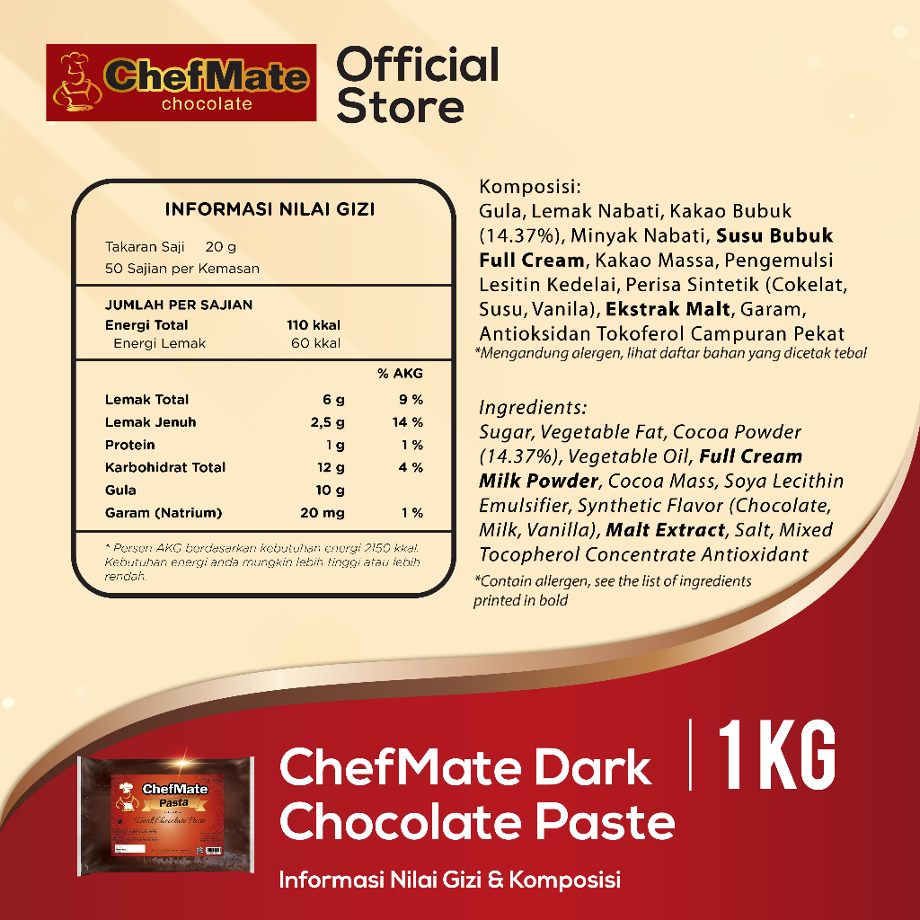 CHEFMATE PASTA DARK CHOCOLATE COKLAT 1 KG READY STOCK