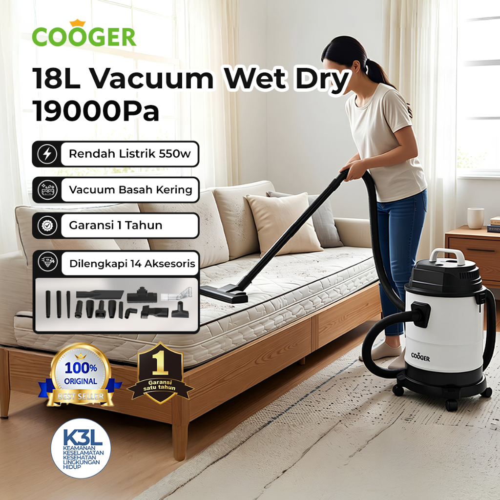 COOGER Vacuum Cleaner Wet and Dry 18L 19000Pa Rendah Listrik 550w Penyedot Debu Kotoran Basah Kering