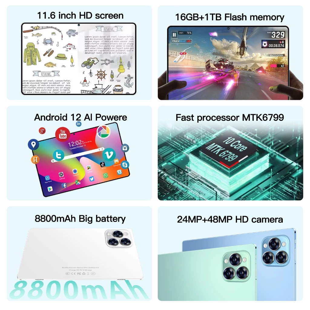 CY Elektronik Tablet Pro16 (16GB+512GB)11.6inch"lPS Screen Tablet Android 12 8800 mAh Dual Sim CardadvanTablet Murah100ribuan Anak Tablet android murah