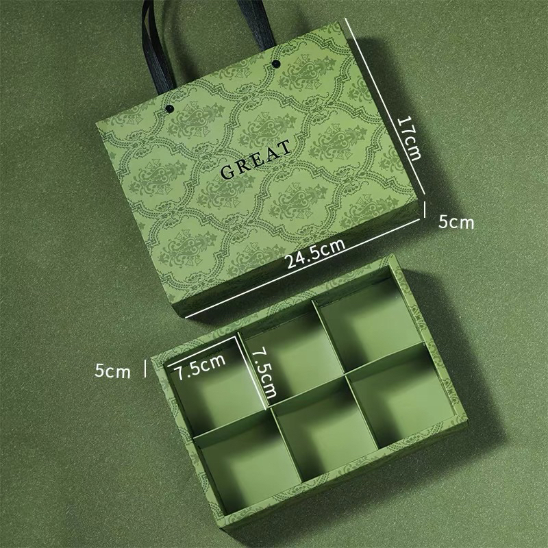 Cake box green sekat 6 / kotak kue sekat tenteng hijau lebaran / snack nastar cupcake mooncake / hampers kemasan packaging premium / lebaran idul fitri box ramadan eid mubarak 2024