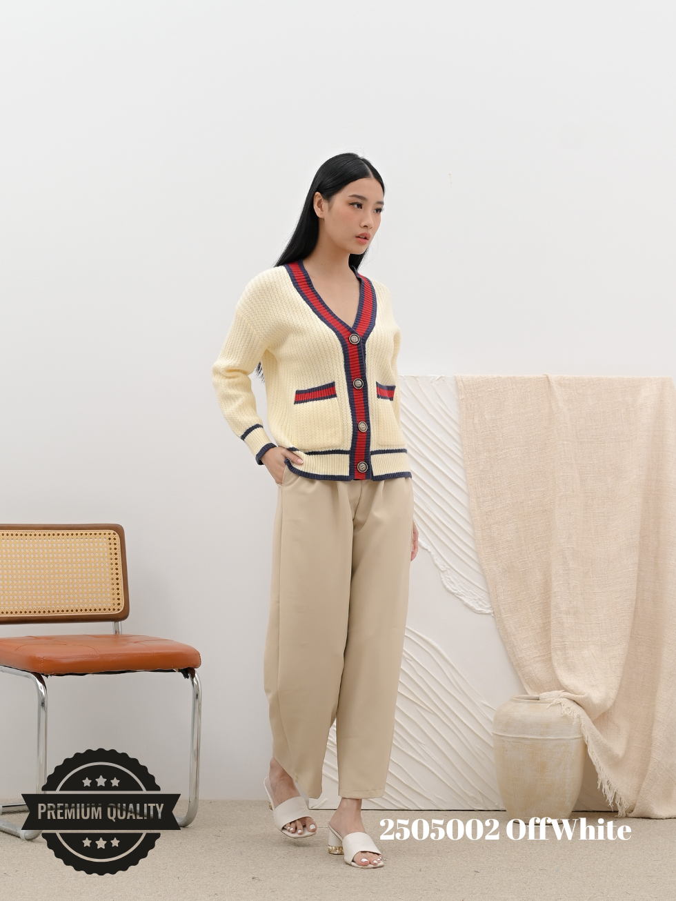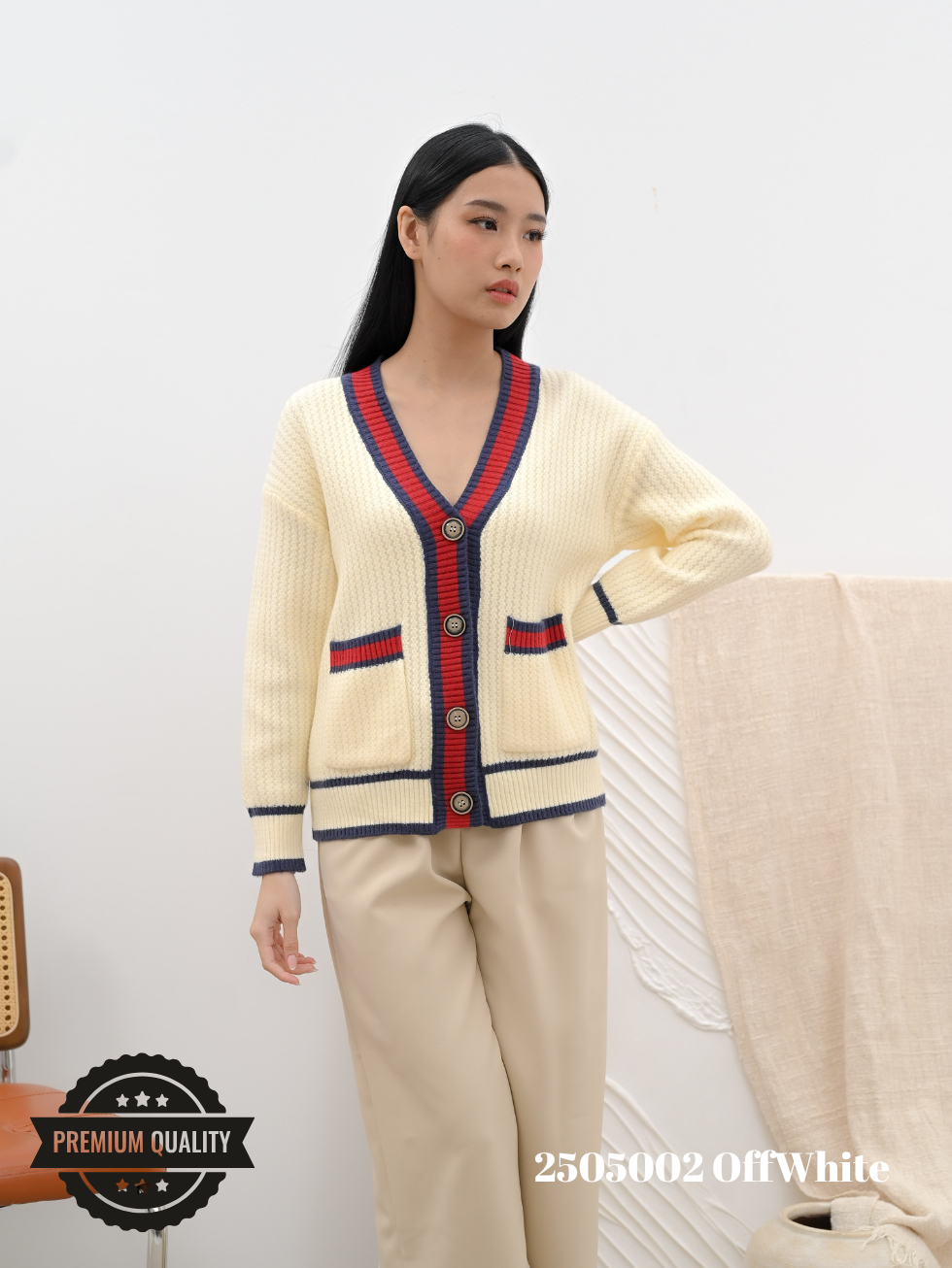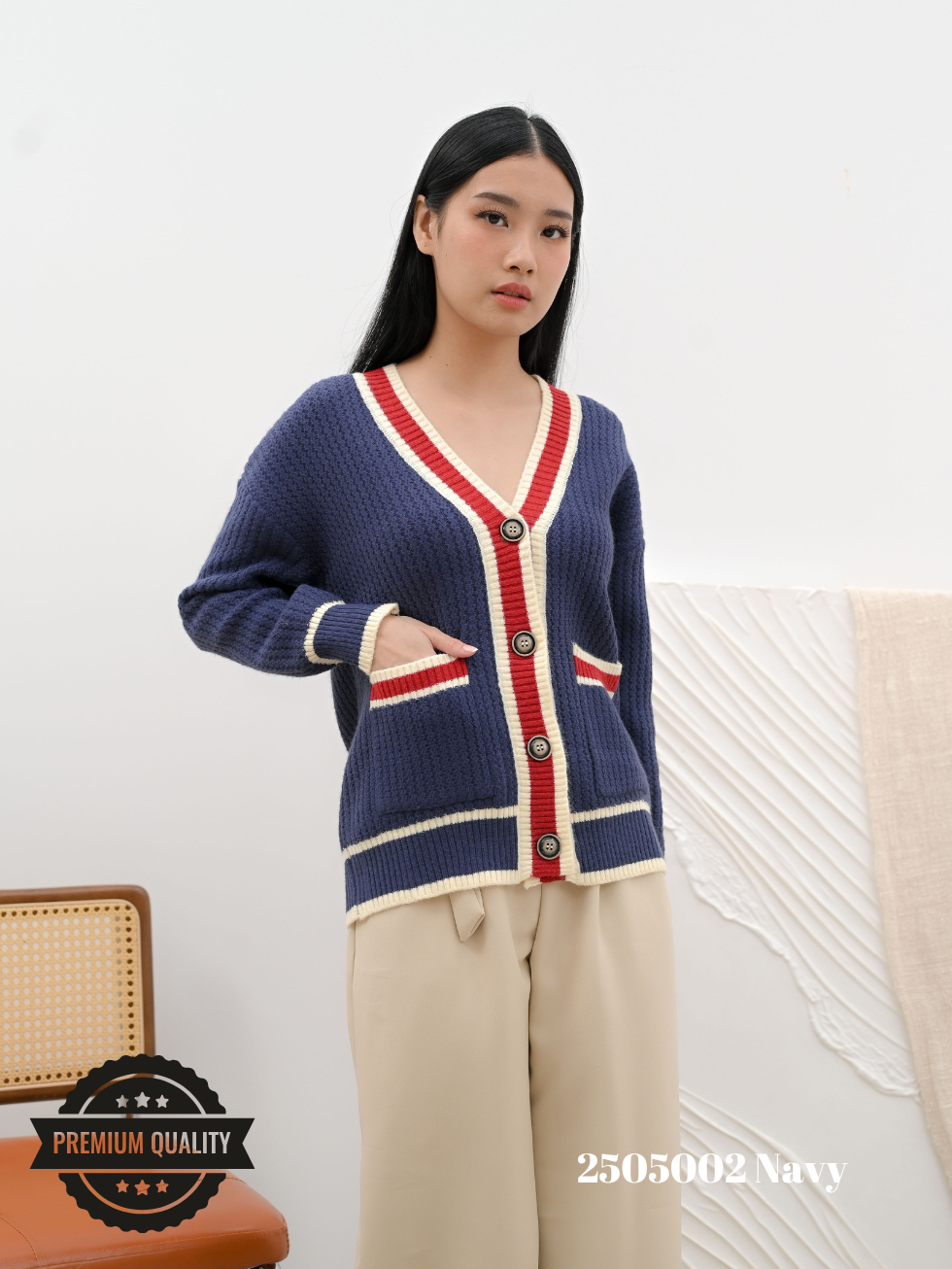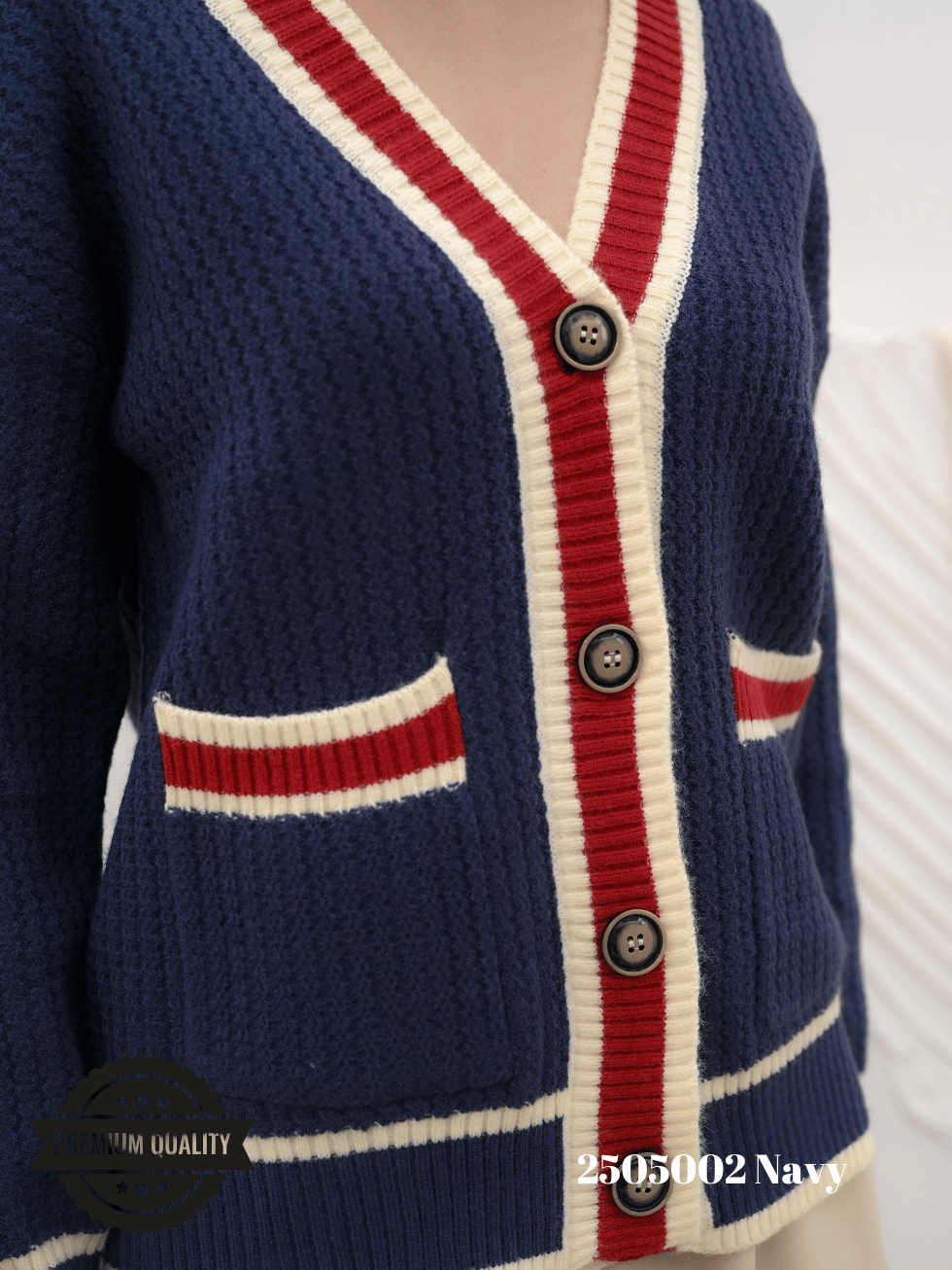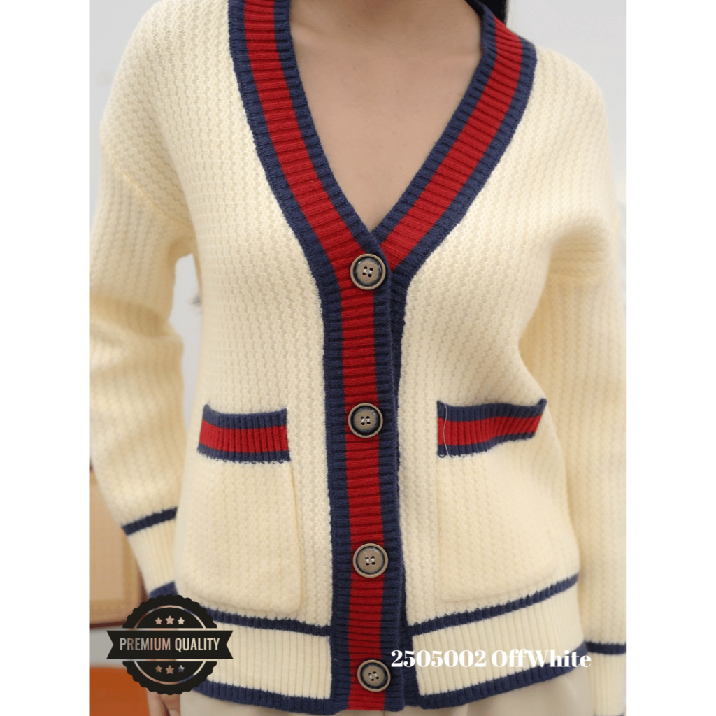 Cammomile 2505002 V26 Cardigan Rajut lis merah Lengan panjang Korean style