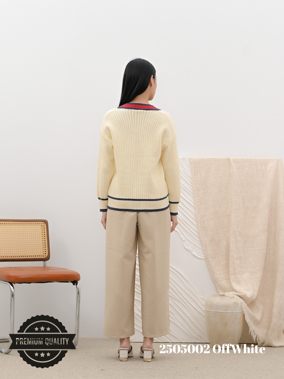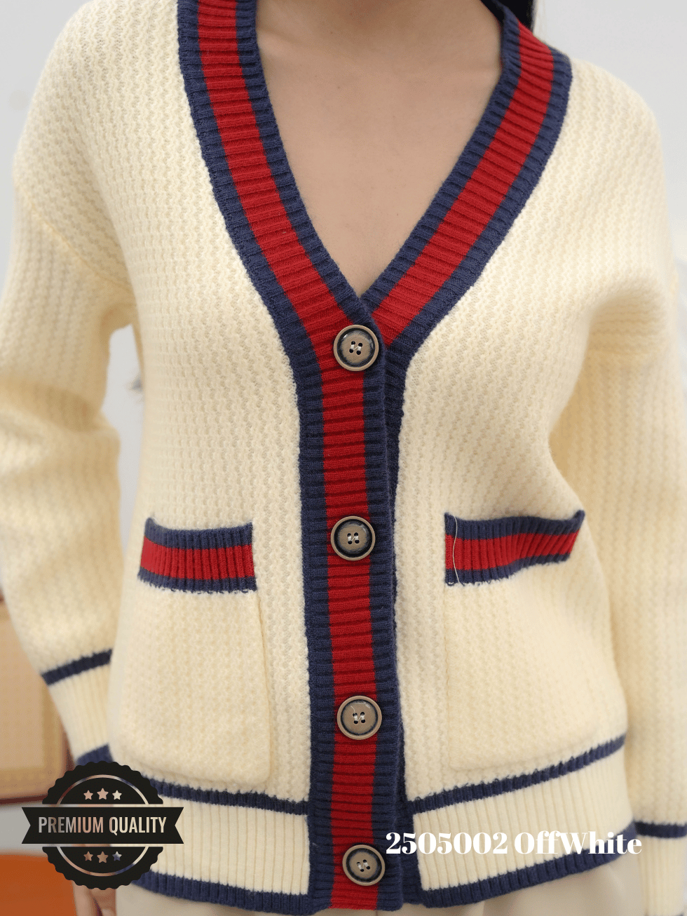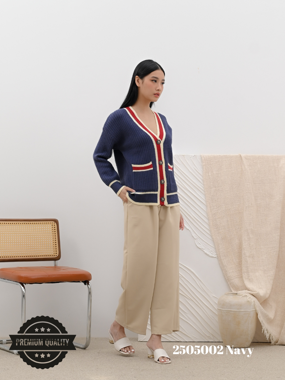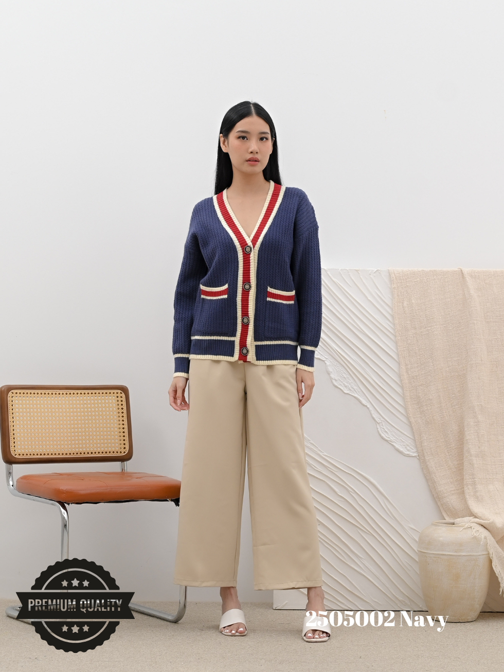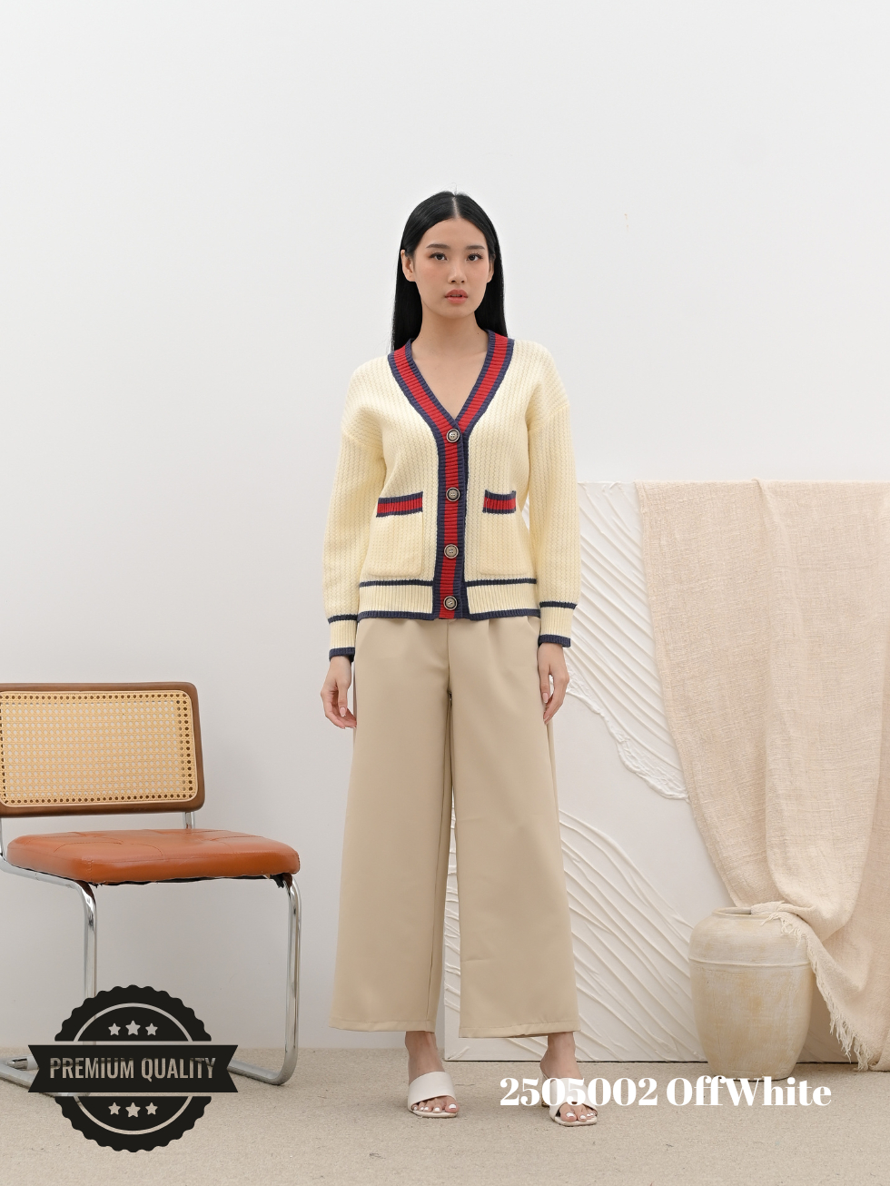 Cammomile 2505002 V26 Cardigan Rajut lis merah Lengan panjang Korean style