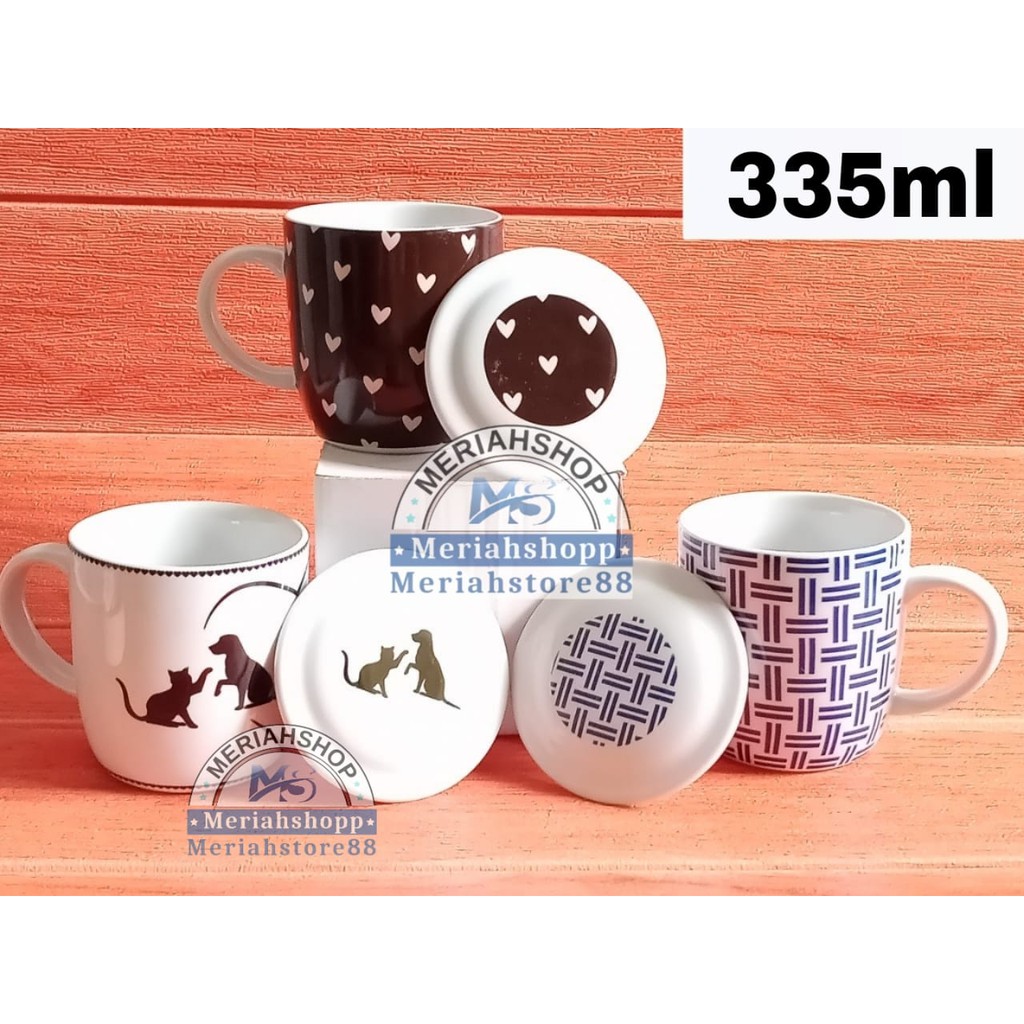 Cangkir Gelas Mug 335ml Keramik TEBALL plus Penutup Kopi Teh Air