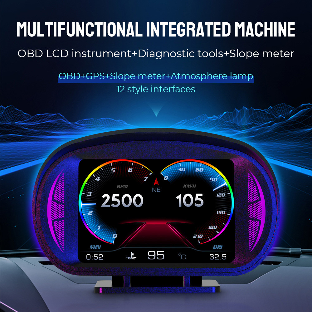 Car Head Up Display Turbo Brake Test Security Alarm Overspeed Alarm Slope Tilt Meter P2 Dual System HUD OBD2 GPS Speedometer