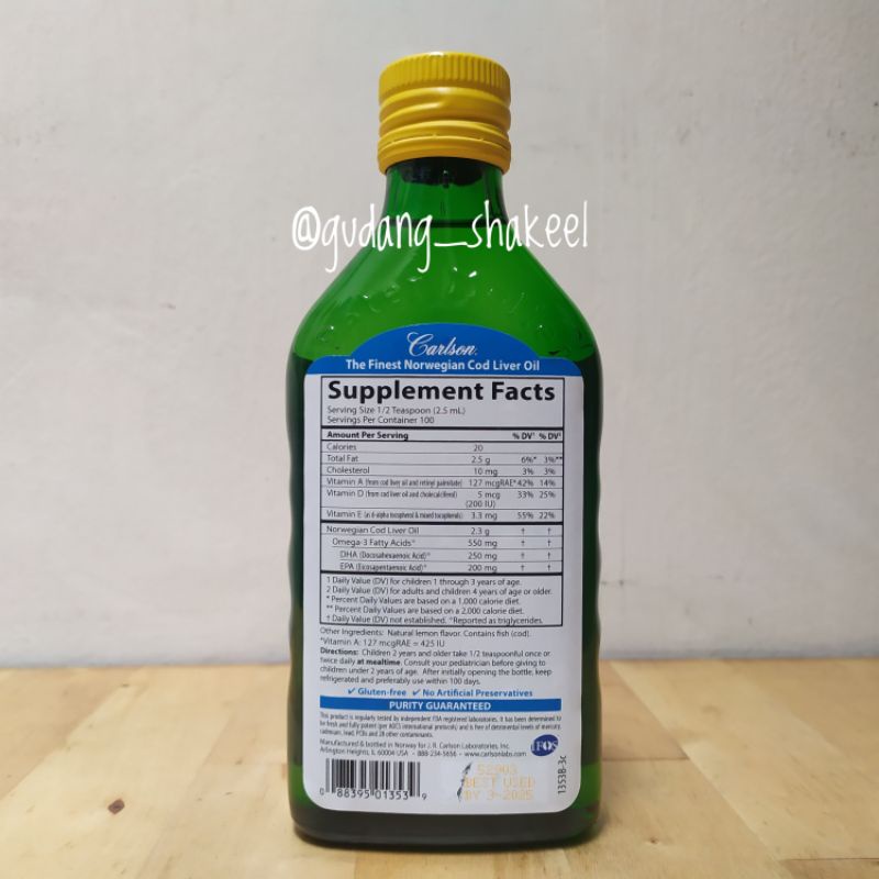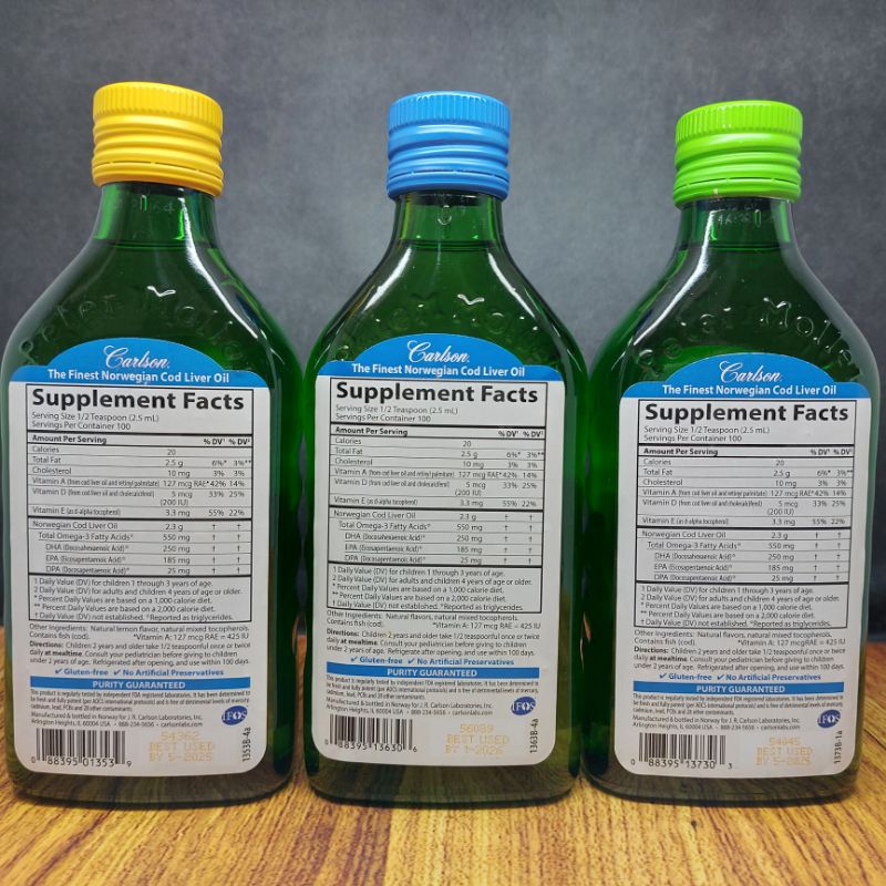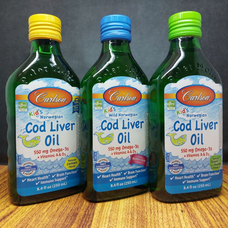 Carlson Labs Kids Norwegian Cod Liver Oil Natural Lemon / Bubble Gum / Green Apple Flavor 500 mg Omega 3 + Vitamin A & D3 250 ml