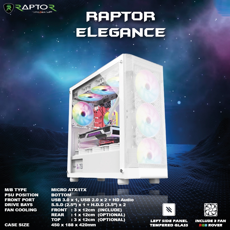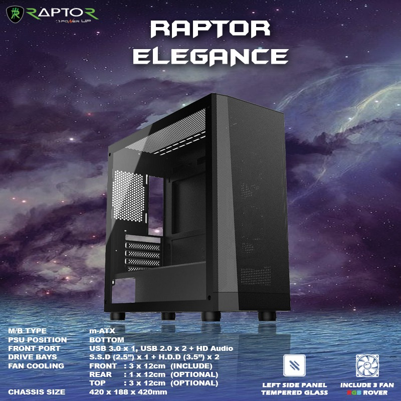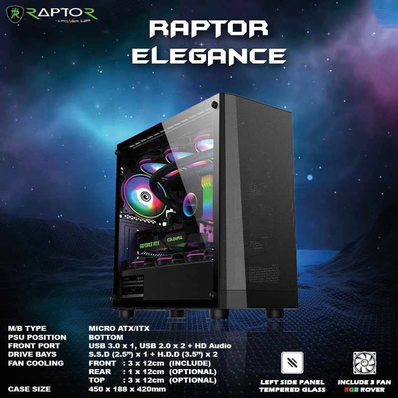 Casing Gaming/PC/Office RAPTOR ELEGANCE - include 3 FAN RGB ROVER