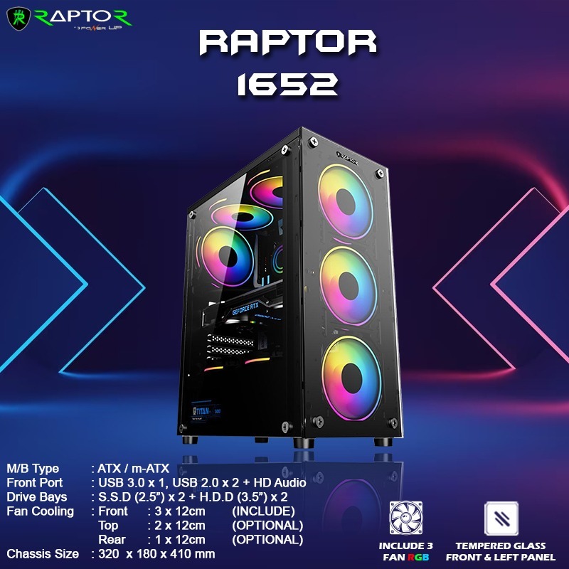 Casing PC Gaming Raptor Strike Series R-1652 ATX / M-ATX Include 3 Fan RGB