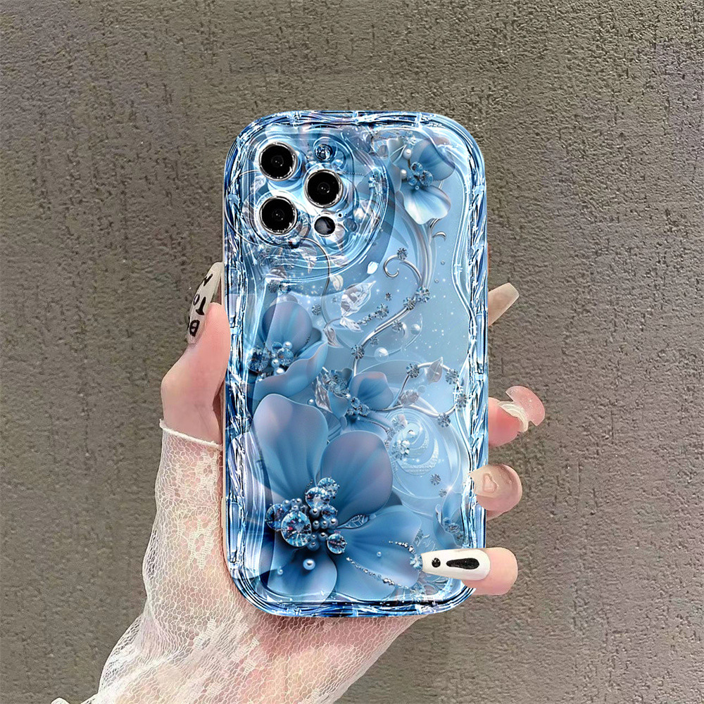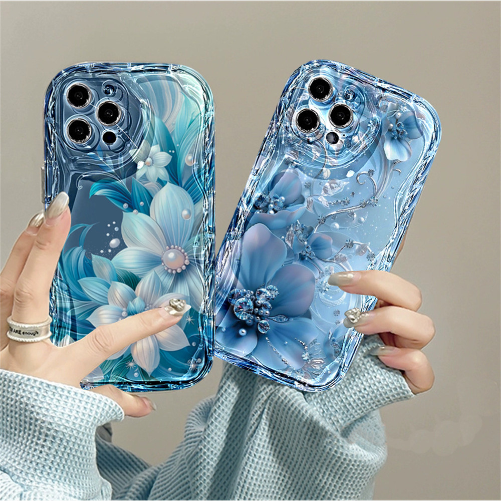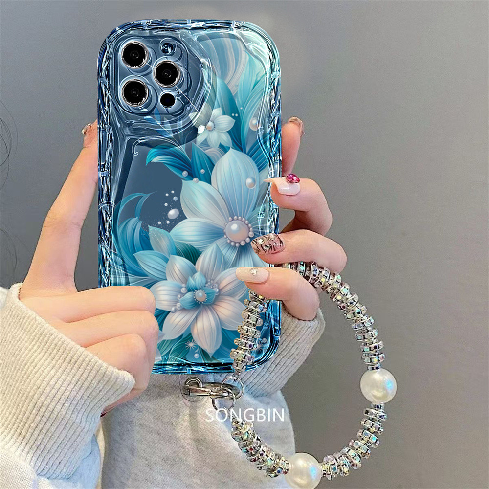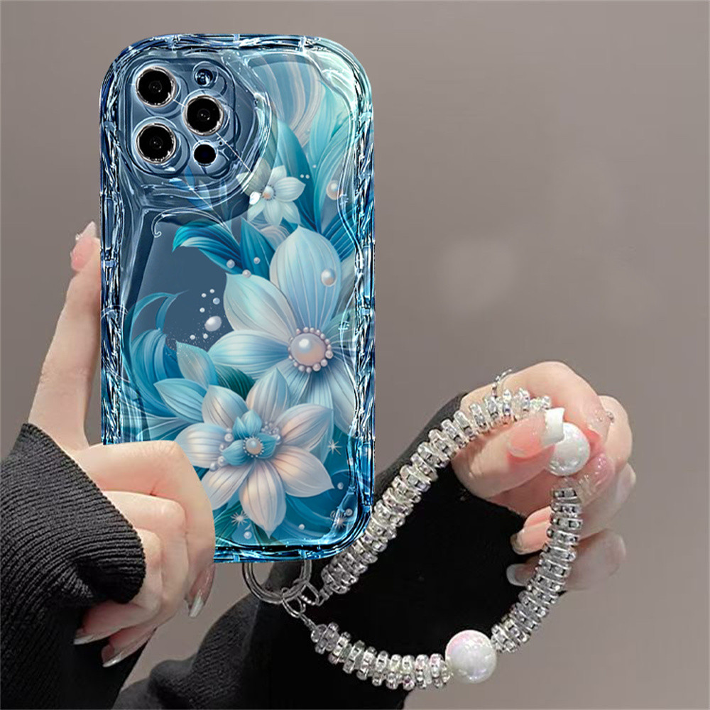 Casing hp iPhone 11 iPhone 7 Plus 12 14 13 15 Pro Max iPhoneXR 8Plus X XS Max iPhone 6s 7 8 6 Plus SE 2020 Lanyard Pearl Wave Blue Flower Case