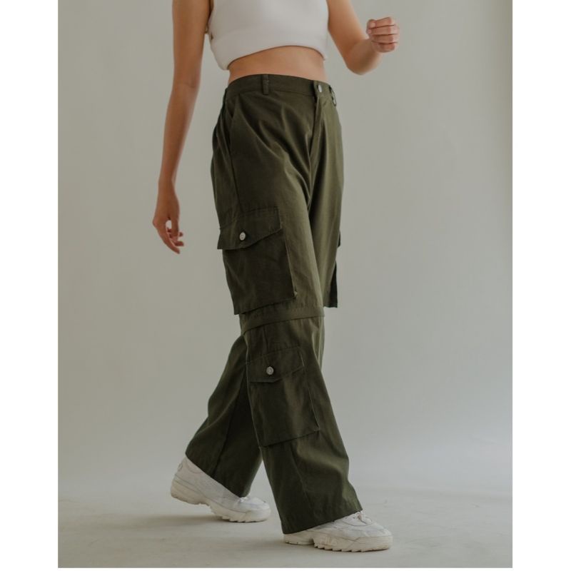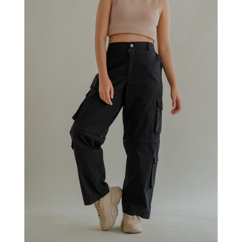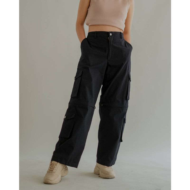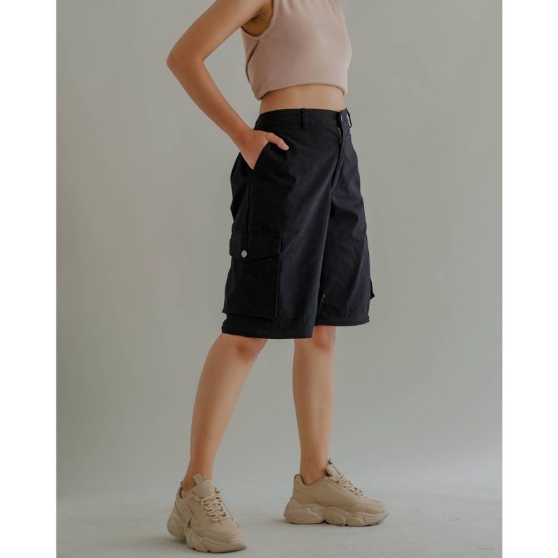Celana Cargo Highwaist Wanita Multy Pocket Long and Short Hitam Army Moka - Blackbanner onesize S-XL(27-34)