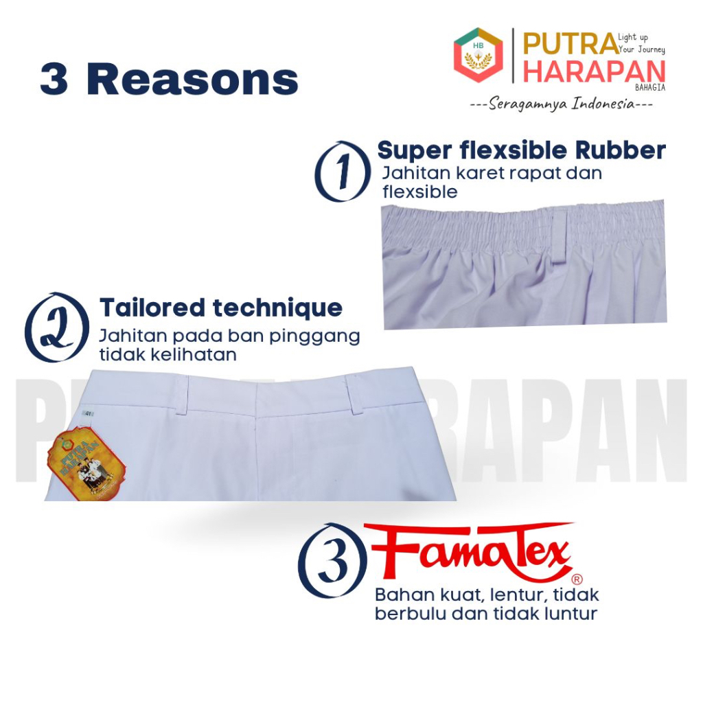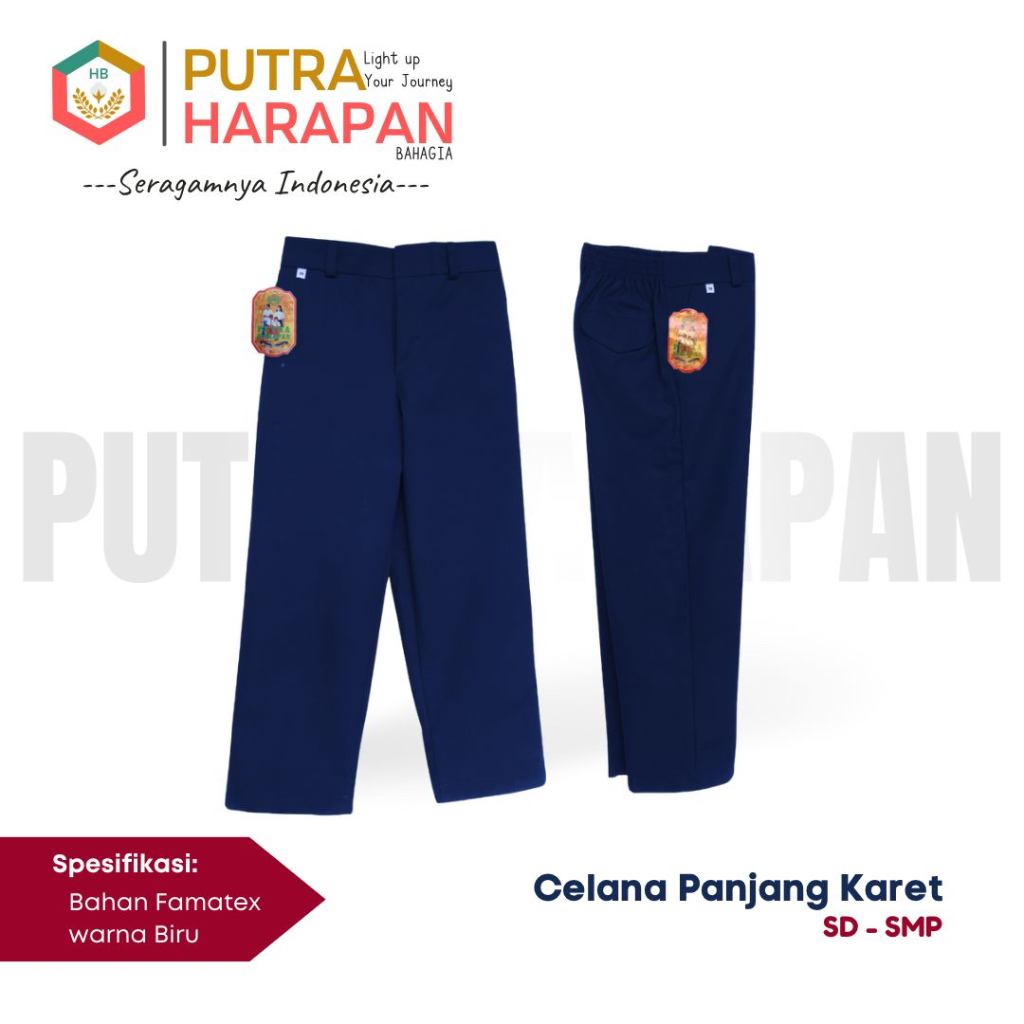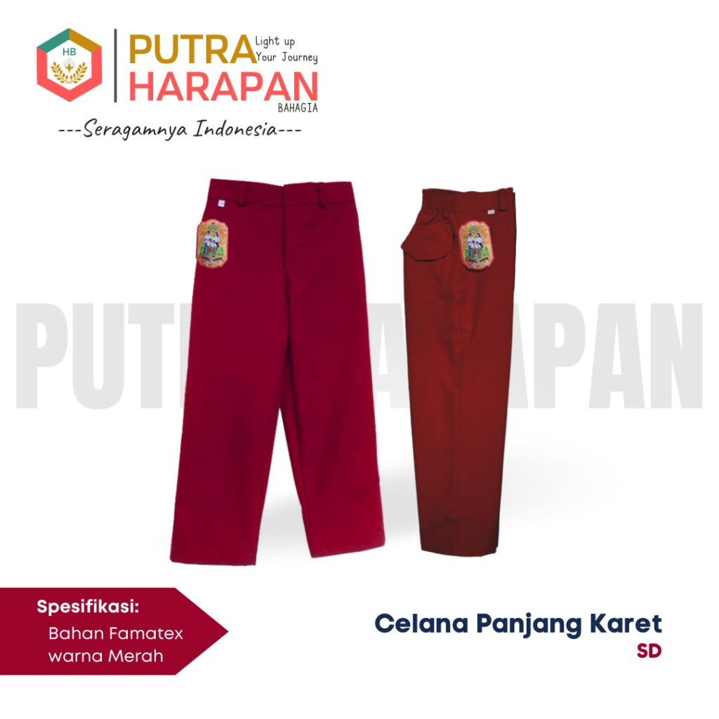 Celana Panjang Karet SD, SMP, SMA Merah, Biru, Putih, Hitam, Cokelat(Pramuka) & Hijau -Seragam Putra Harapan Bahagia-