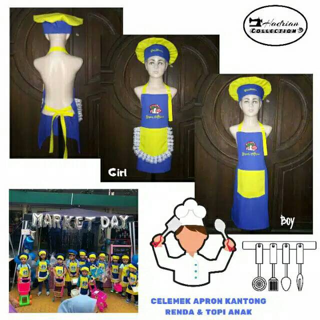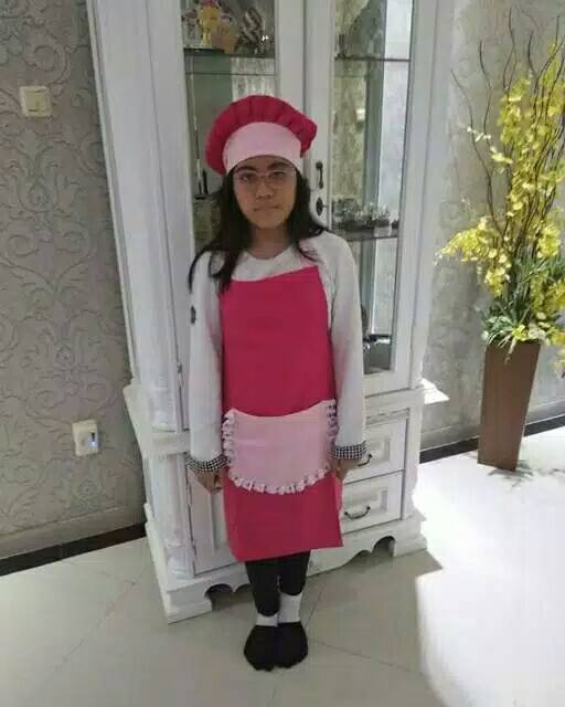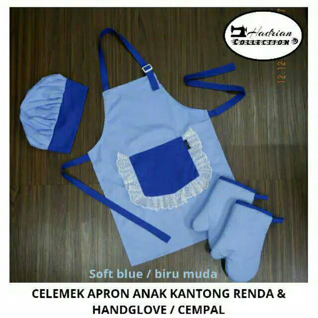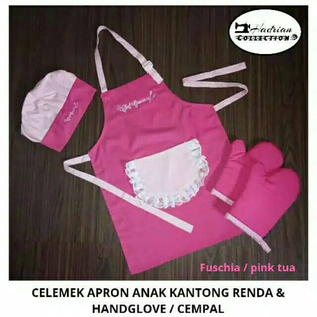 Celemek apron anak renda,Topi koki anak dan hand glove / cempal / sarung tangan anti panas