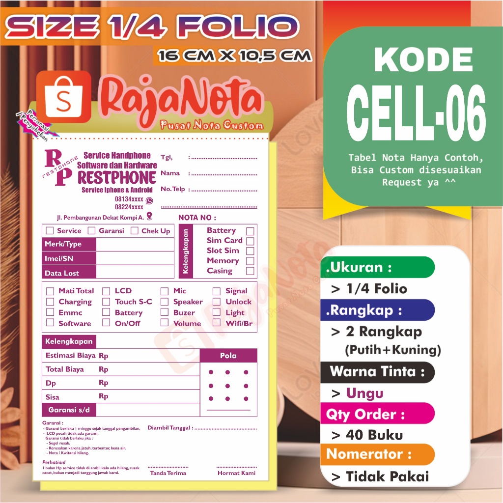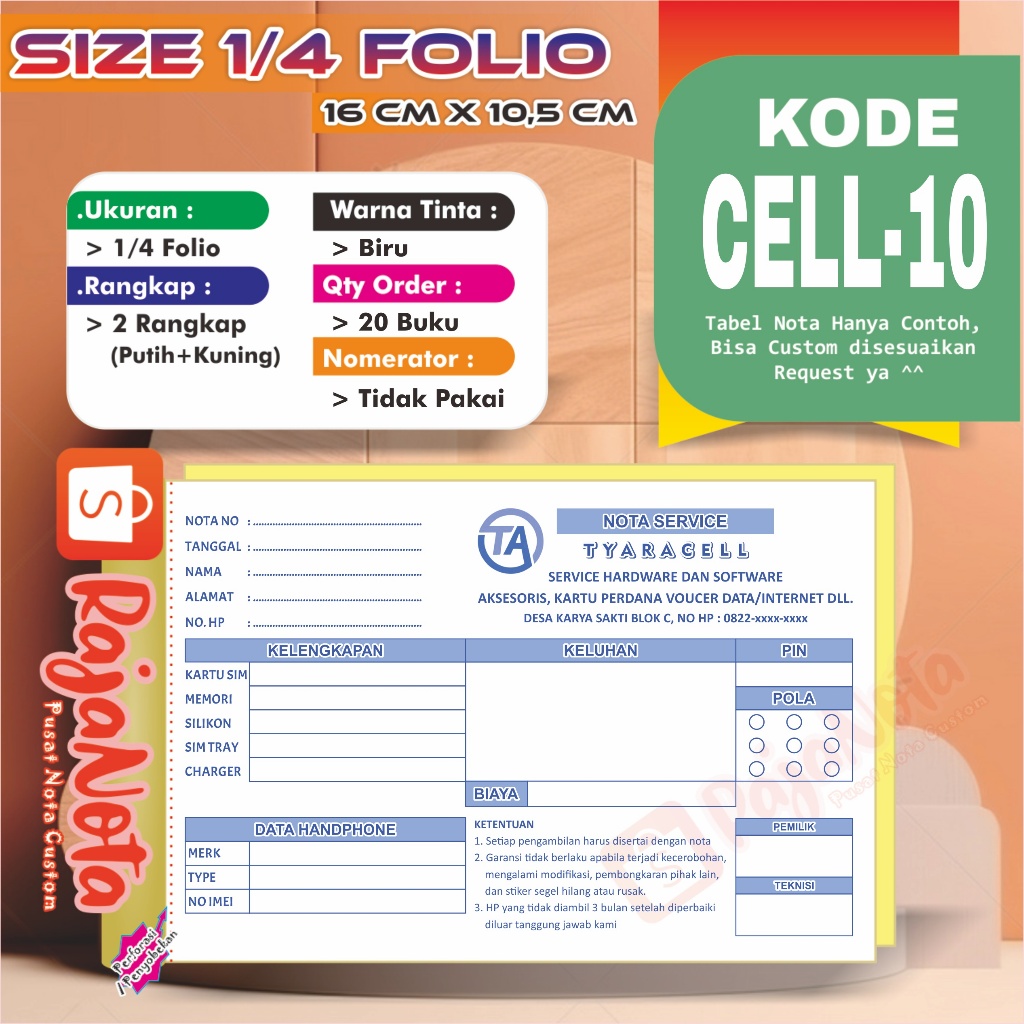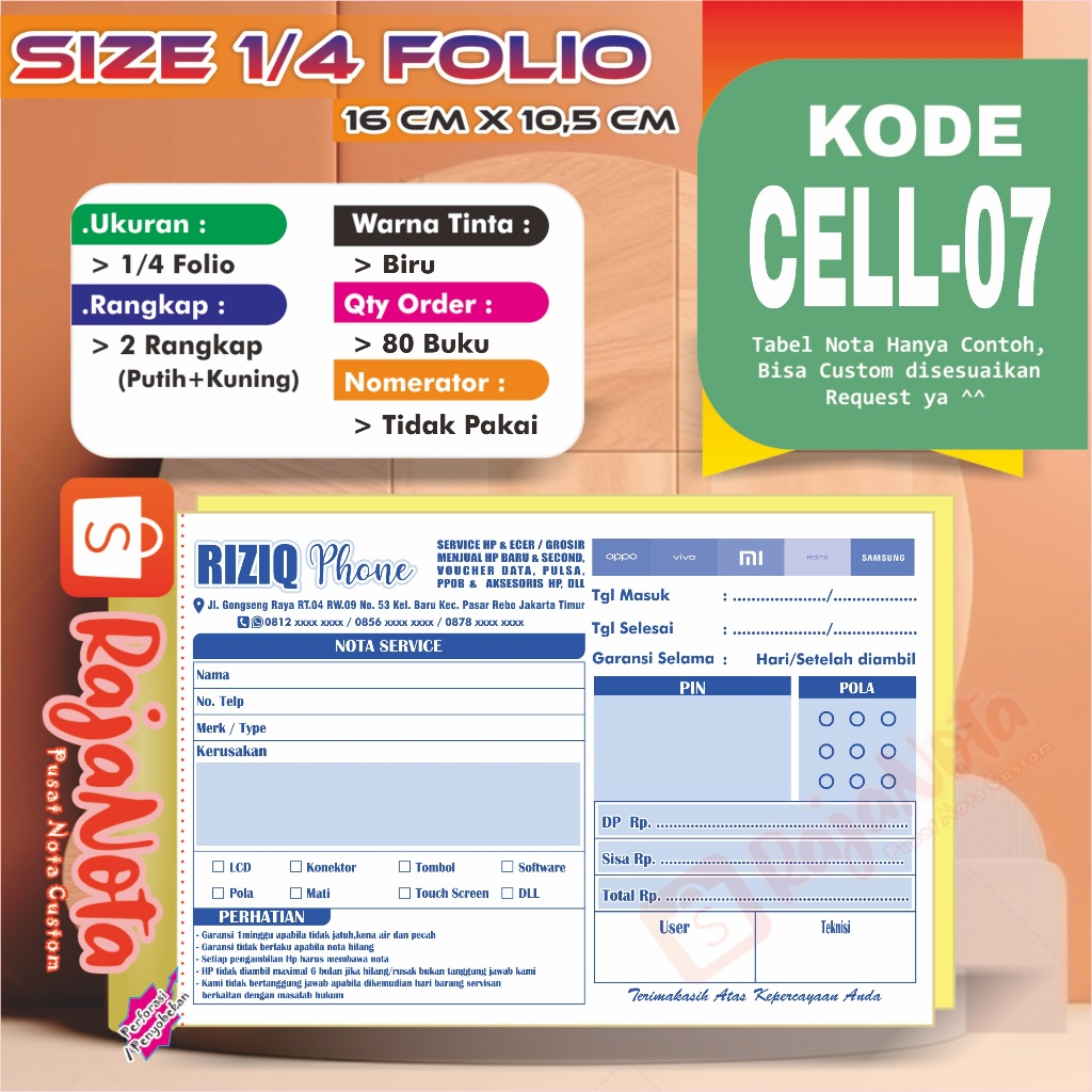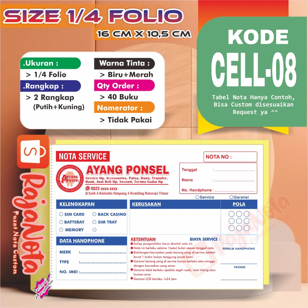 Cetak Nota Konter Servis HP Cellular Custom Request Nama Toko Sendiri 2 rangkap 100 Bisa Desain