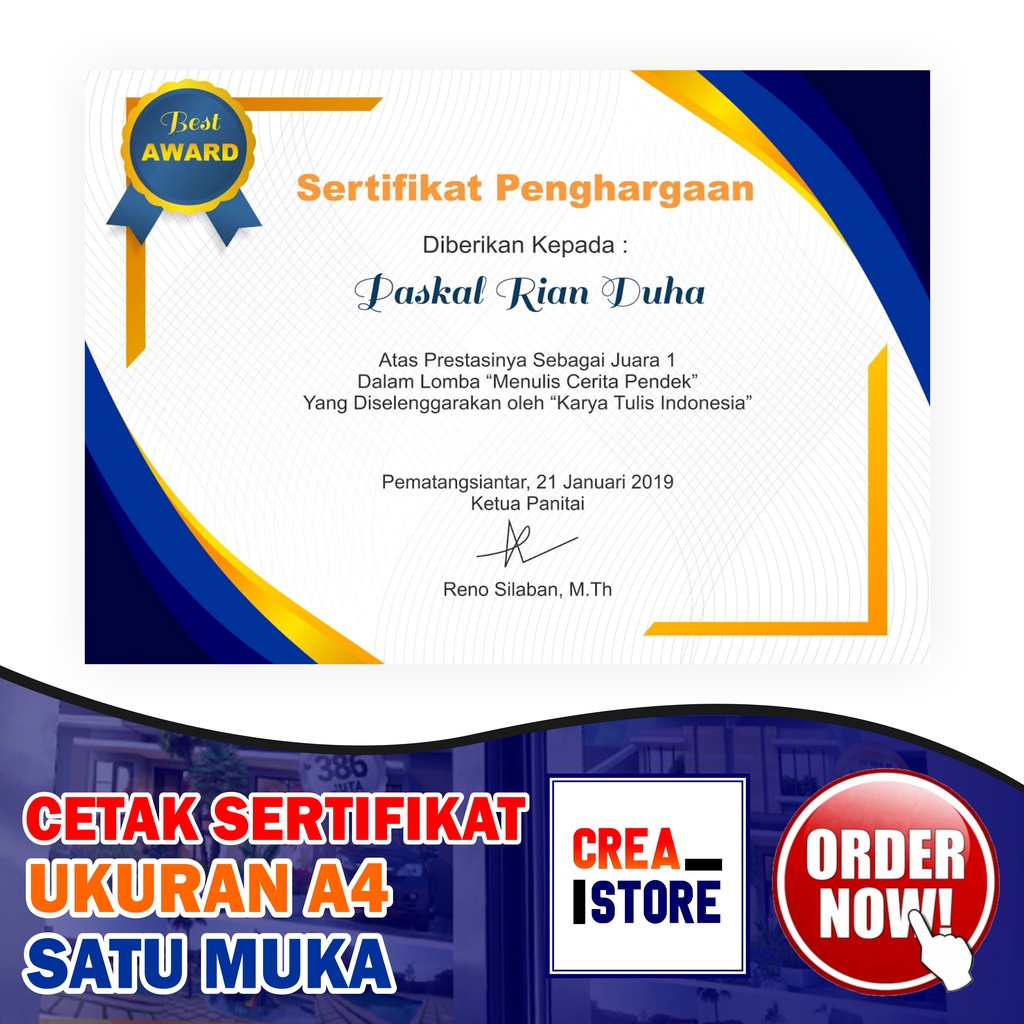 Cetak Sertifikat/Piagam Penghargaan Ukuran A4 Kertas Linen Minimal Cetak 2 Lembar