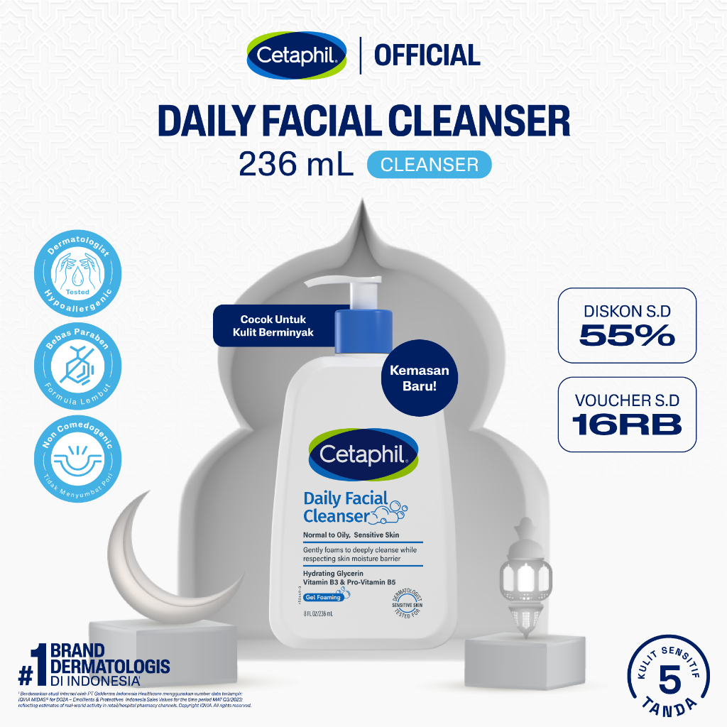 Cetaphil Daily Facial Cleanser 236ml dengan Hydrating Glycerin, Panthenol, Niacinamide untuk meminimalkan tampilan pori-pori pada Kulit Berminyak dan Sensitif