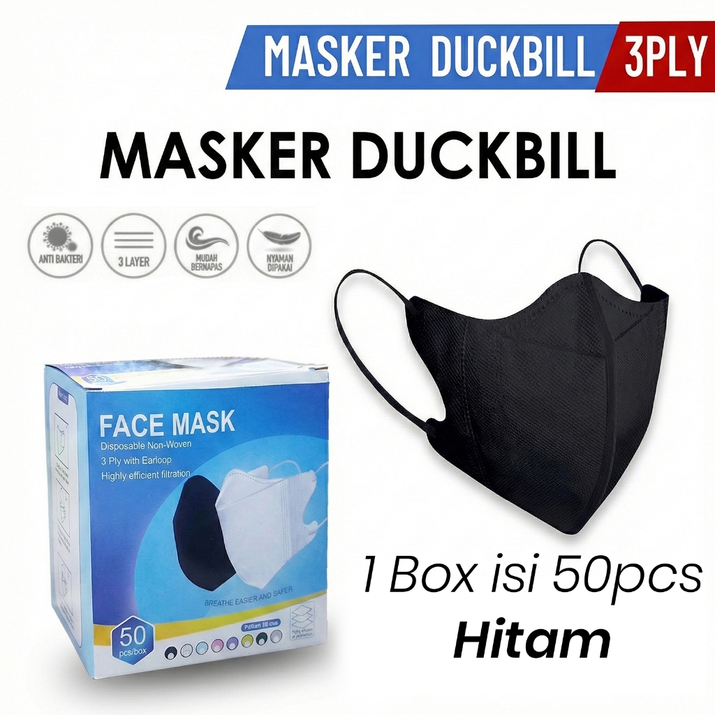 masker duckbill Tebal facemask 3 ply isi 50 pcs per kotak warna hitam putih termurah terlaris