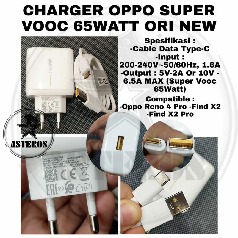 Charger Carger Oppo SUPER VOOC 65W 65 Watt Reno 4 Pro 3 Find X X2 Pro Original Ori USB Type C Cajer Carjer Cas Casan Ces Cesan Hp Handphone Oppo SuperVooc FindX2 Reno10 Reno11 65Watt Flash Charge Charging Pengisian Cepat