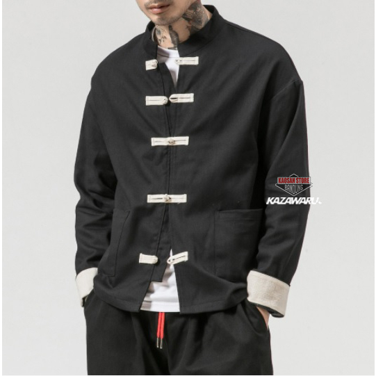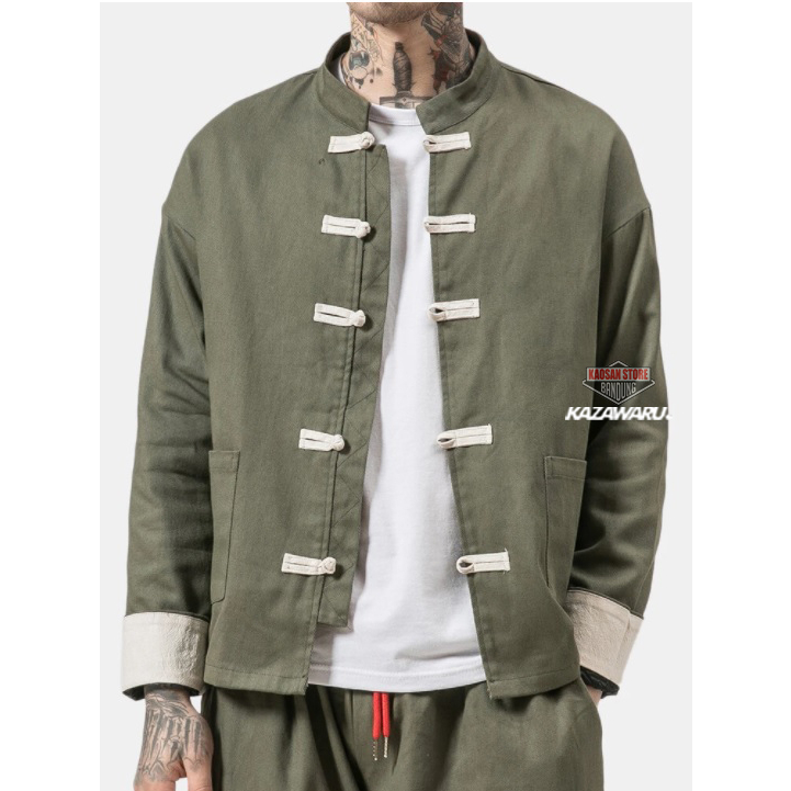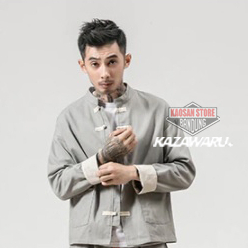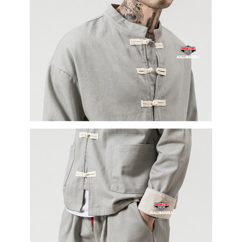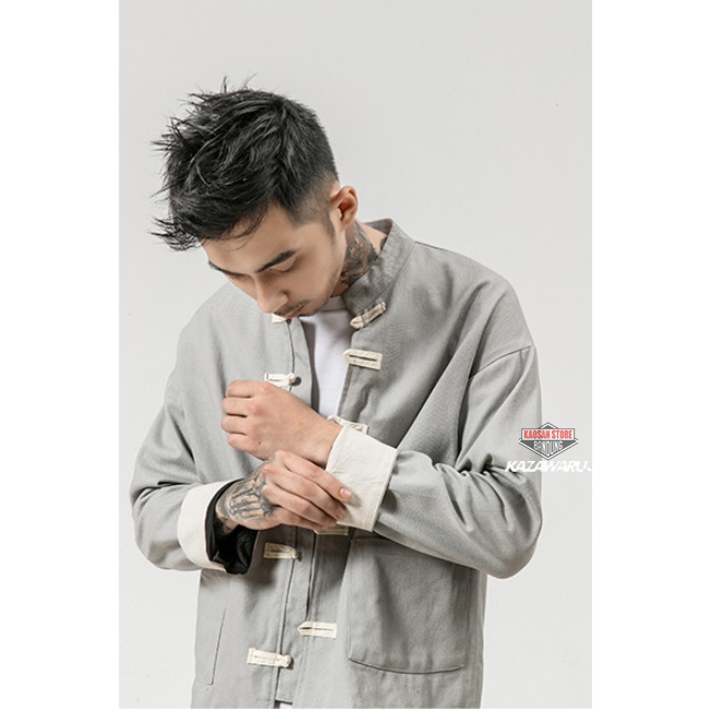 Cheongsam Pria Baju Kemeja Ip Man Ipman Wing CHun Mandarin Japanes Korea Koko Lengan Tangan Panjang Cowo Cowok Laki Laki Muslim Warna Grey Misty Abu Abu