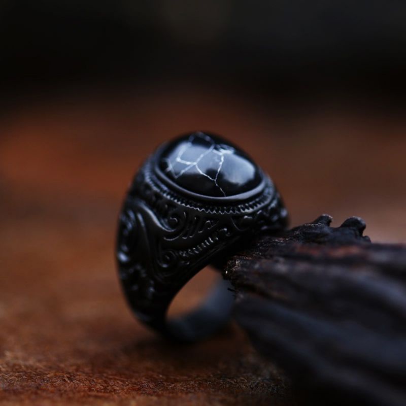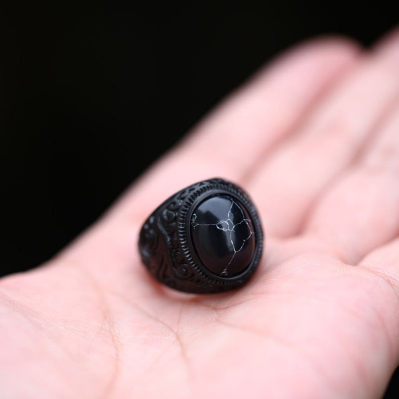 Cincin Pria Batu Pirus Hitam Kura Ring Titanium Retro Hitam All Black Kantoran