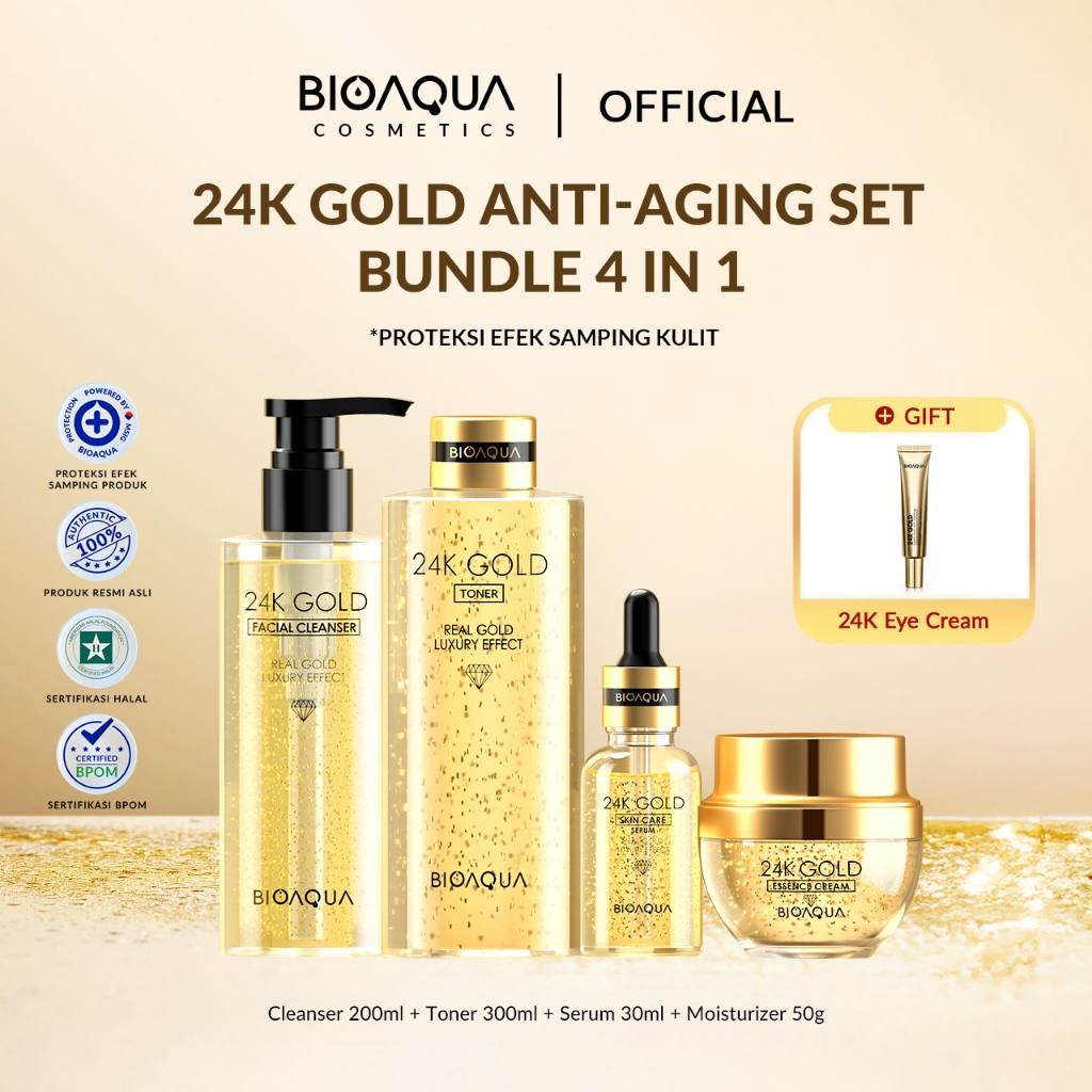 Bioaqua Cosmetics 24K Gold Anti Aging Facial Kit Set Skincare Paketan bpom With Moisturizer Cream / Serum Wajah / Toner / Cleanser Facial Wash