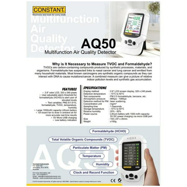 Constant AQ50 Air Quality Detector Meter PM2.5 Dust VOC Haze Formalin Sensor Monitor Alat Ukur Kadar
