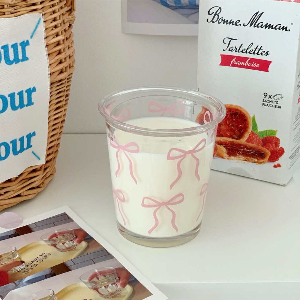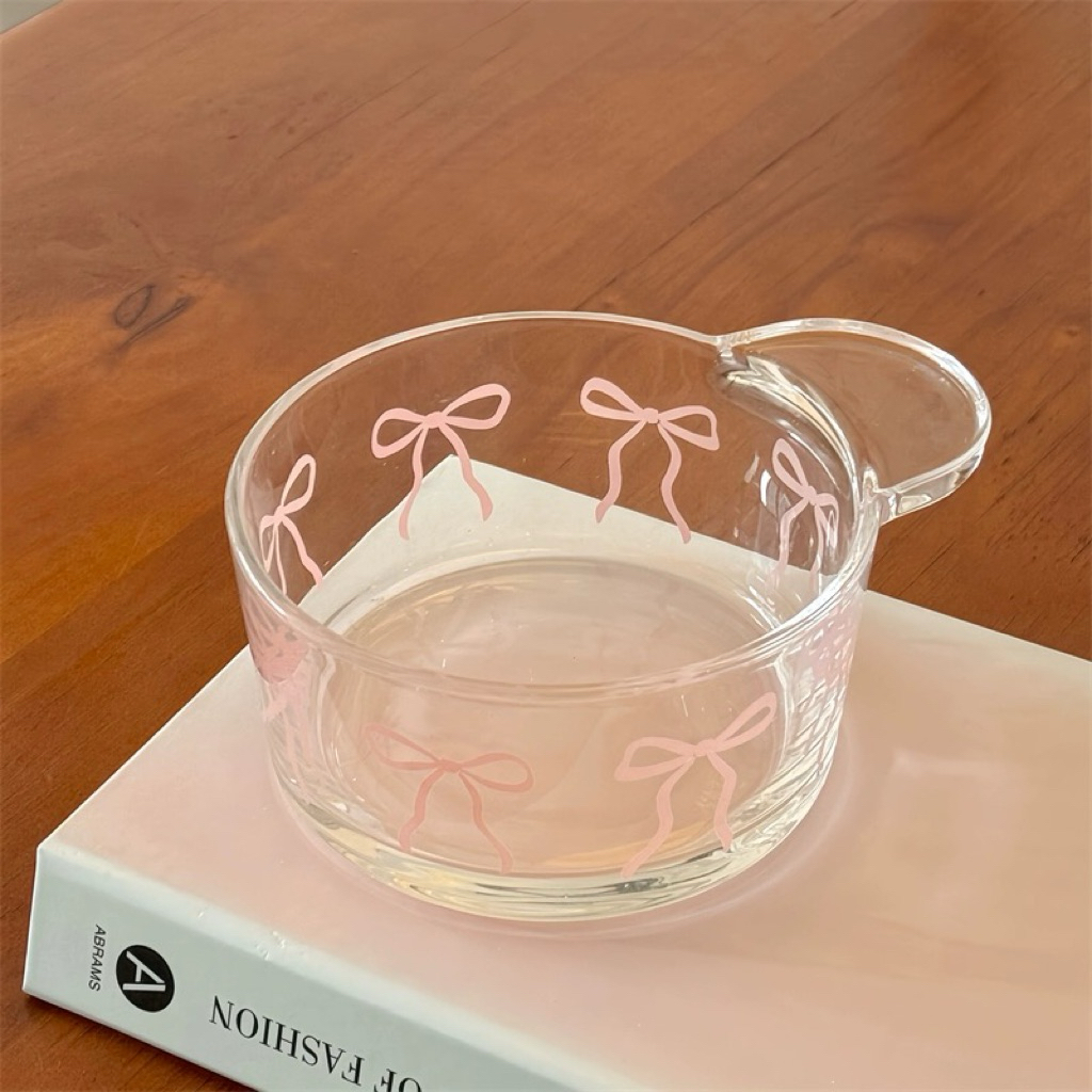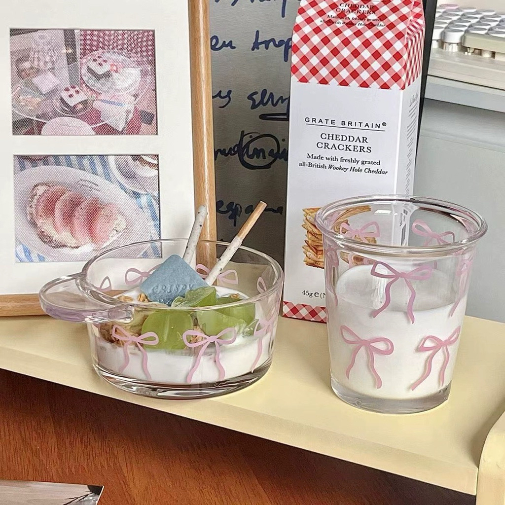 Coquette Glass Cup & Cereal Bowl Collections | Aesthetic Coffee Cup 350ml | Gelas Kaca Cafe Aesthetic Motif Pita & Mangkok Kaca Motif Pita | Cangkir | Korean Home Cafe Glassle