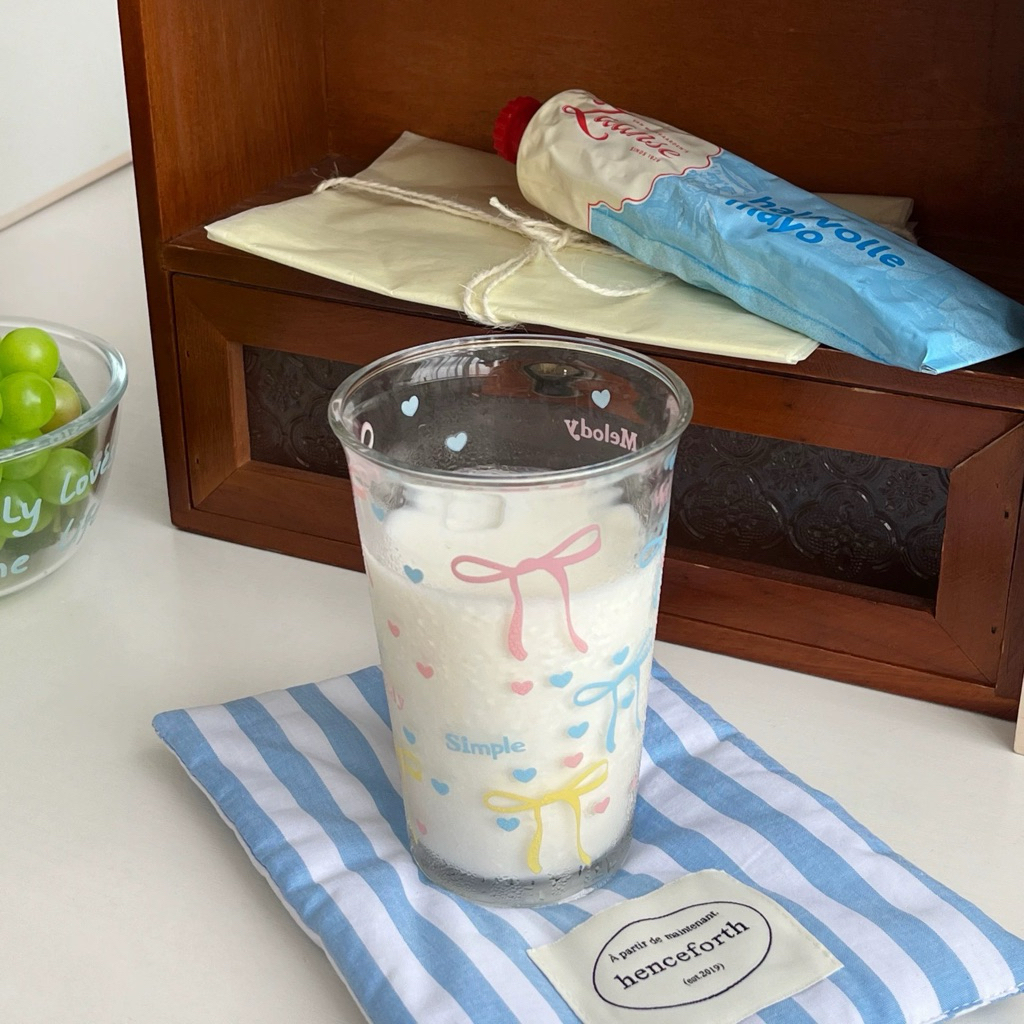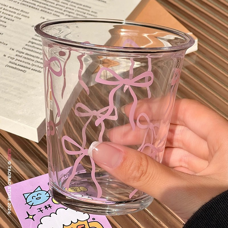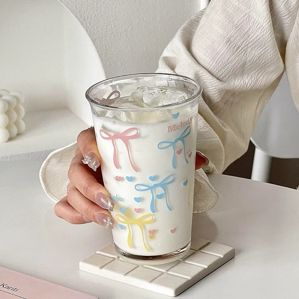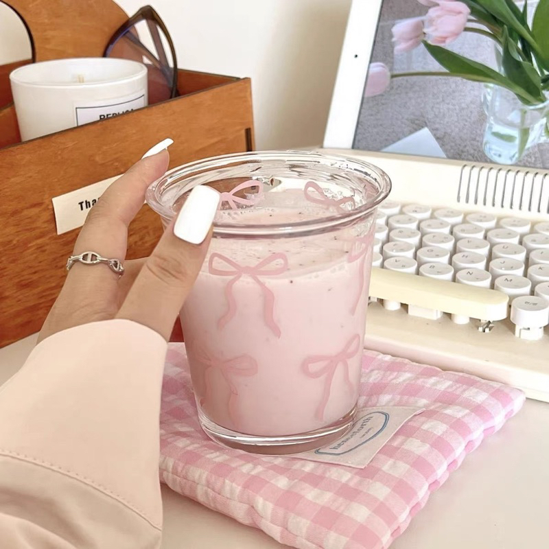 Coquette Glass Cup & Cereal Bowl Collections | Aesthetic Coffee Cup 350ml | Gelas Kaca Cafe Aesthetic Motif Pita & Mangkok Kaca Motif Pita | Cangkir | Korean Home Cafe Glassle