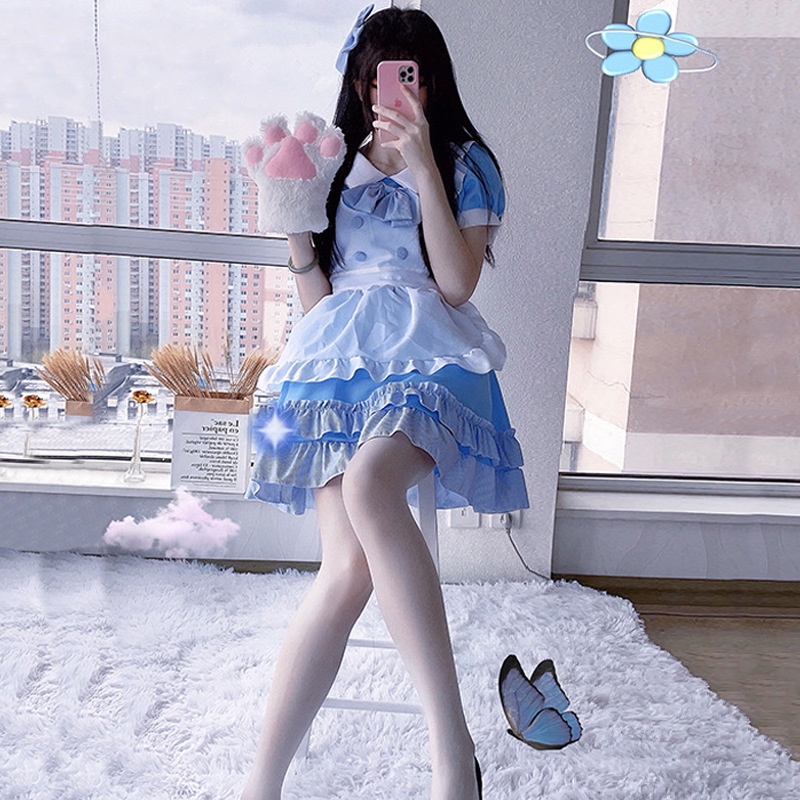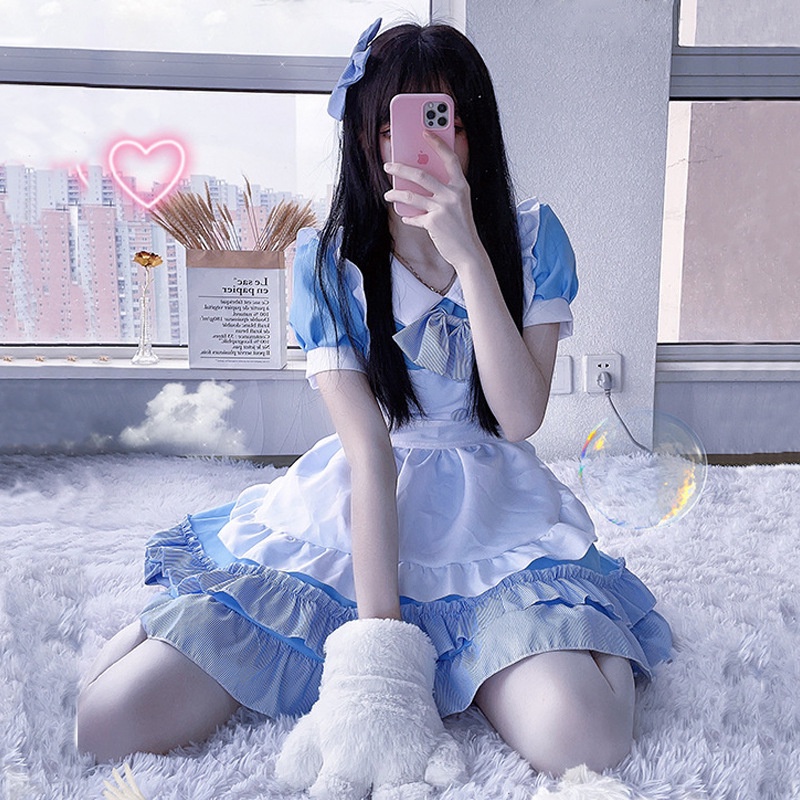 Costum Wanita Biru Putih Kostum Pelayan Cosplay Anime Lolita Lembut Gas Jepang Cute Lolita Gaun