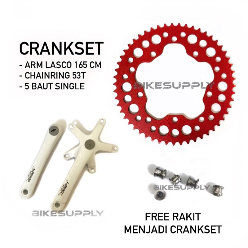 Crankset Piringan Sepeda Single 1 Speed 165 mm 53T (Crank Arm Lasco Putih + Chainring XLR8 Model Lubang Lubang Bubble Merah) Alloy