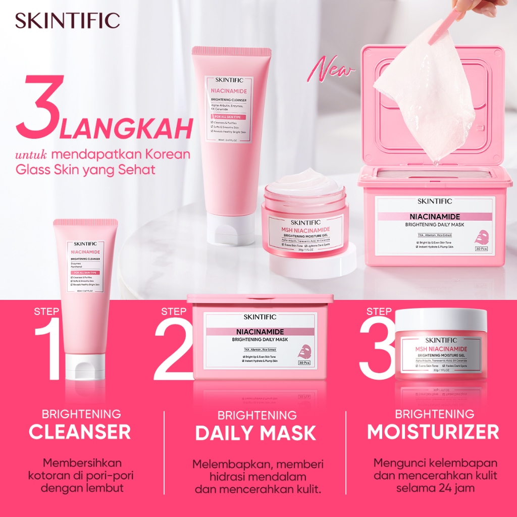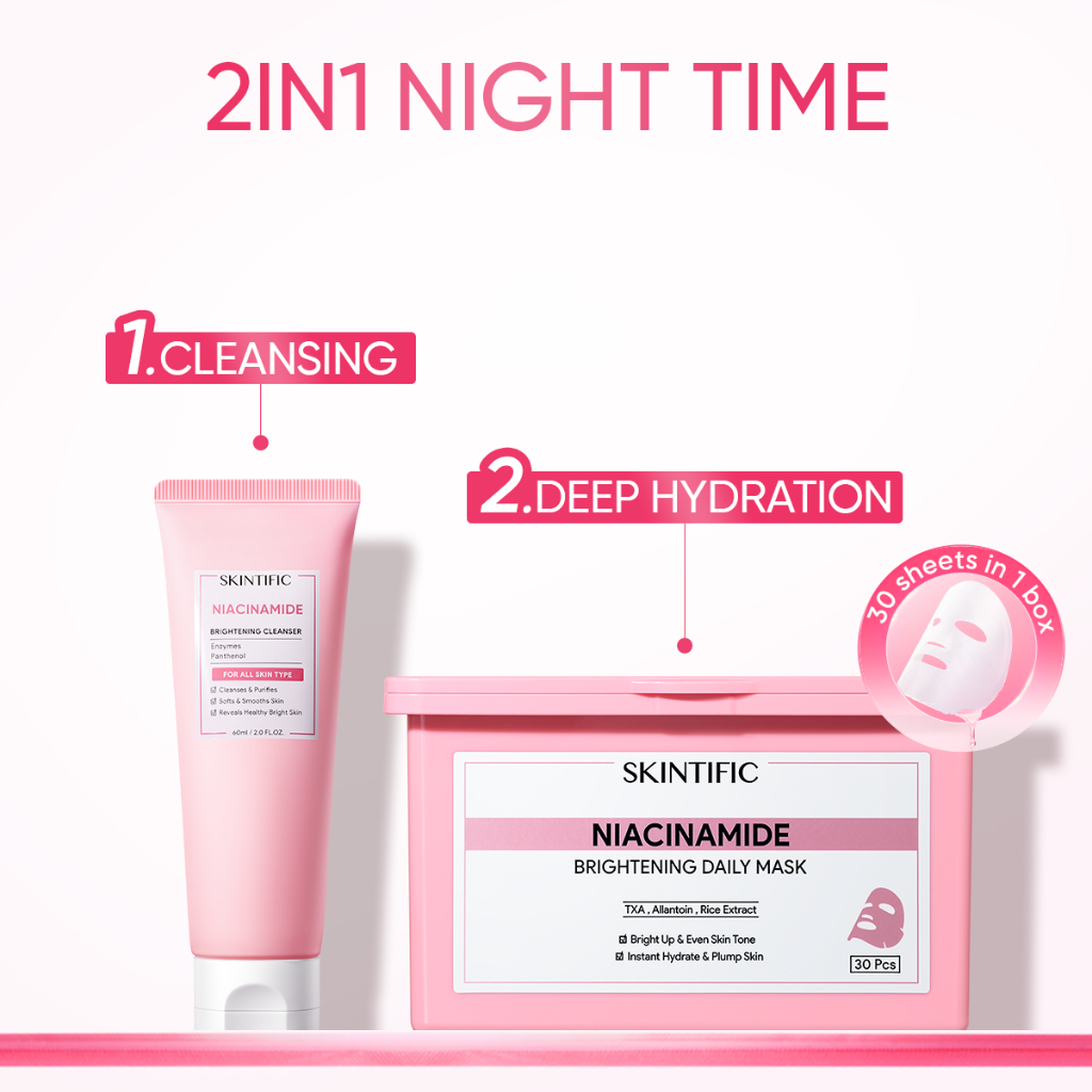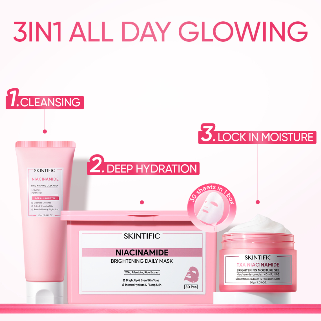 SKINTIFIC - 3X Glowing Routine Set | 3IN1 Niacinamide Brightening Daily Mask / Cleanser / Moiturizer / Toner 3pcs Day Night Time 2pcs masker wajah Deep Moisture Hydration Pinky Duo Trio
