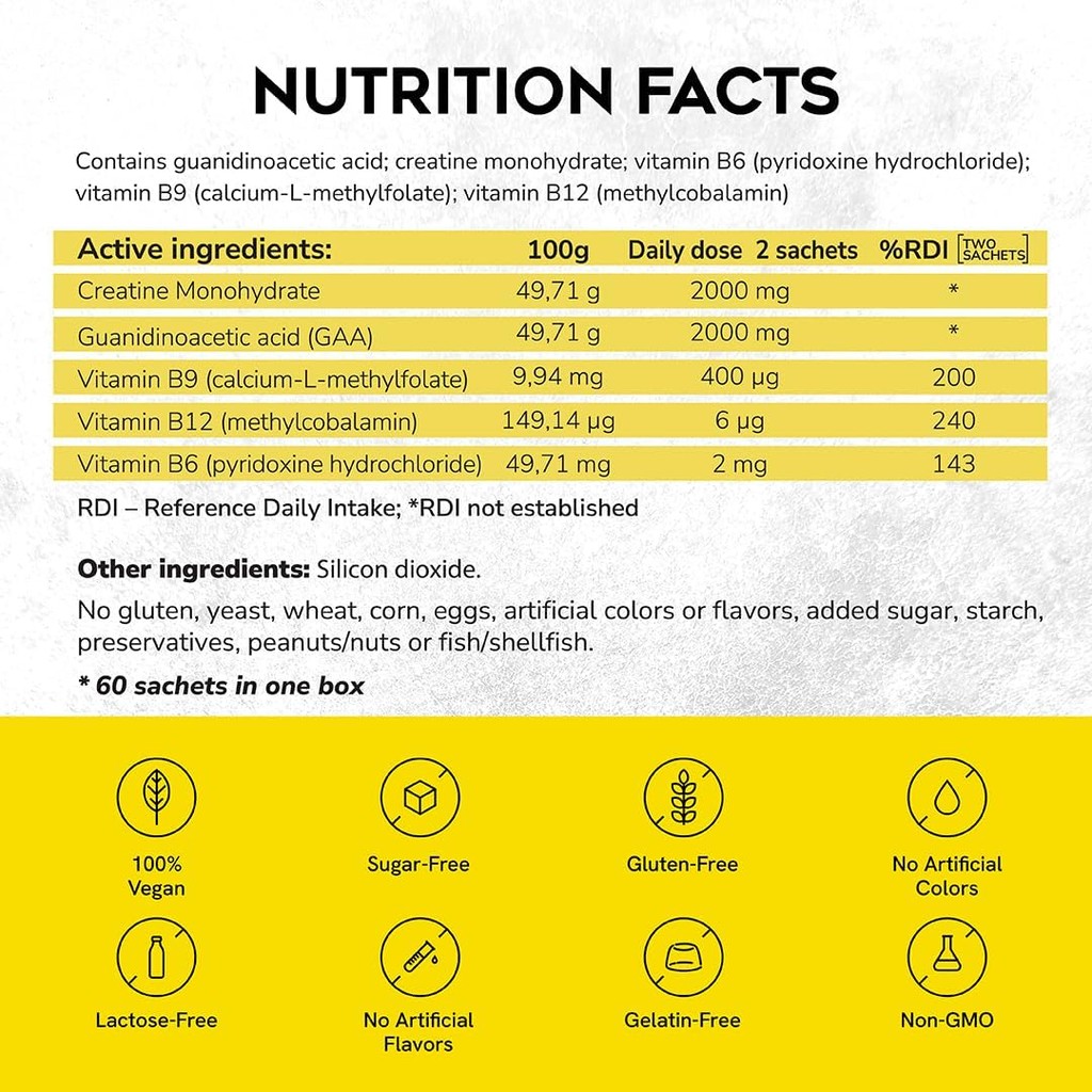Cregaatine Micronized Creatine Monohydrate + GAA Increase Strength no water retention bantu fokus memori 60 Sachets, 30 Servings kreatin