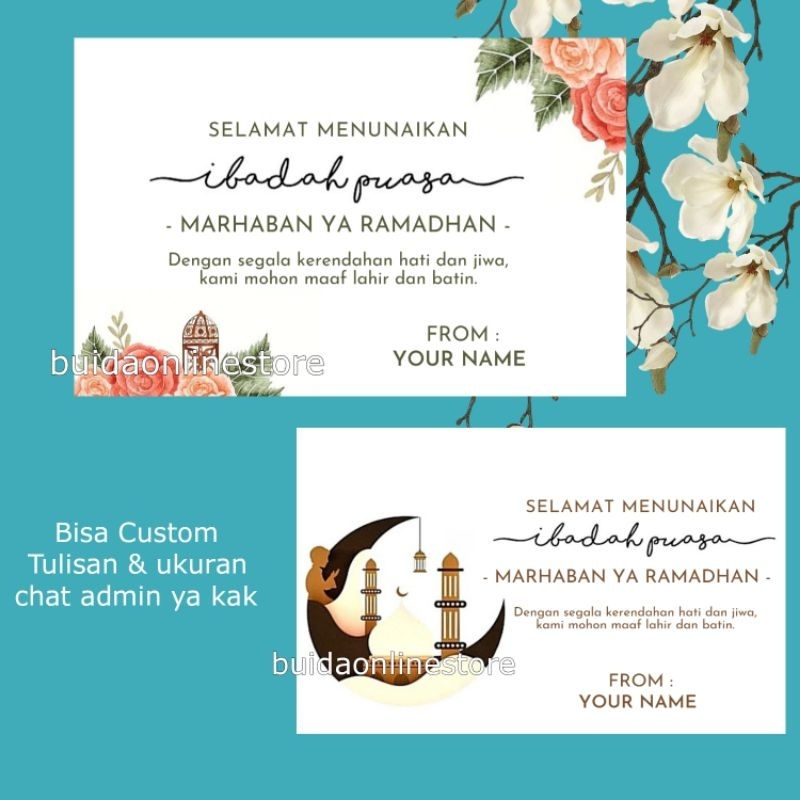 Custom Kartu Ucapan Marhaban Ya Ramadhan Stiker Label Sticker Menyambut bulan suci ibadah puasa bisa ganti tulisan nama keluarga olshop ukuran kata kalimat greeting card hampers parcel hantaran bingkisan toples mika tas thinwall paperbag goodiebag