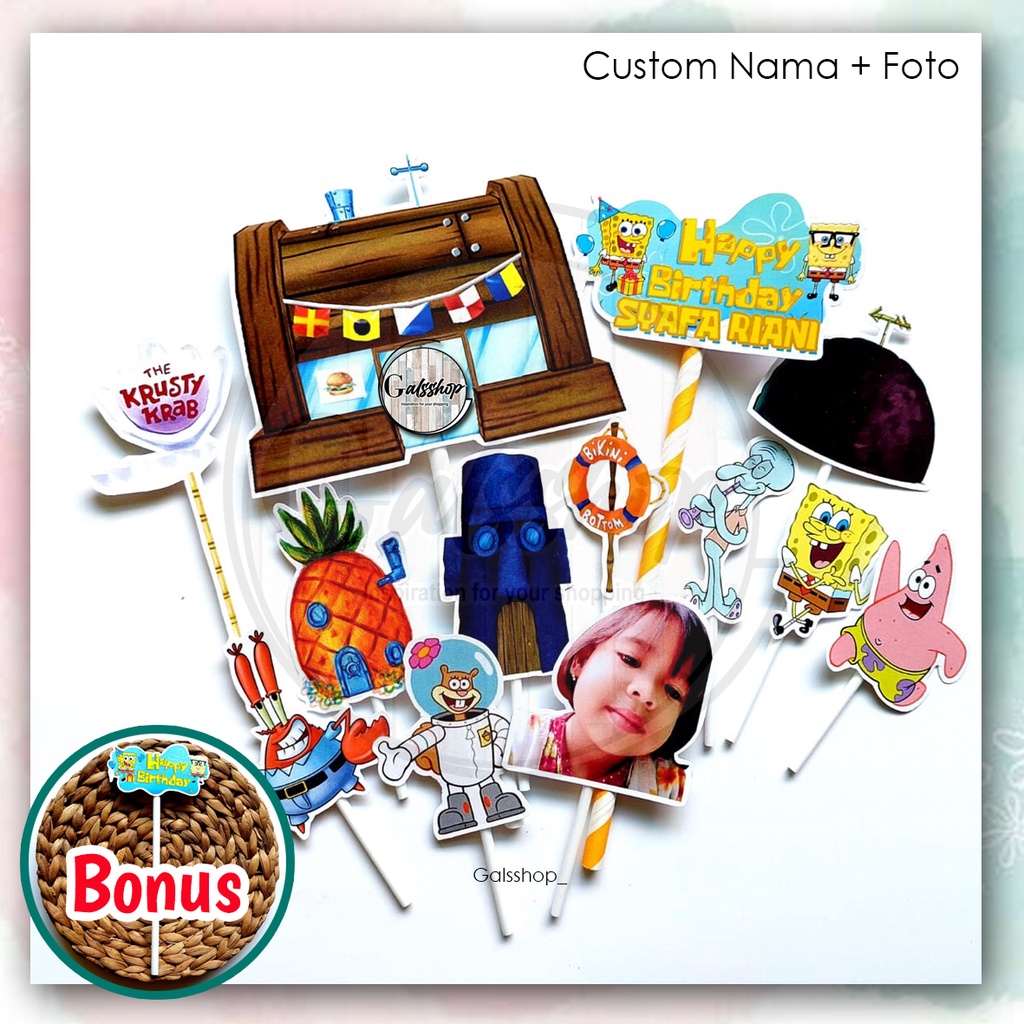 Custom Nama/ Foto / Toppercake Plus Spongebob Part 2 / Hiasan Kue / Cake Topper