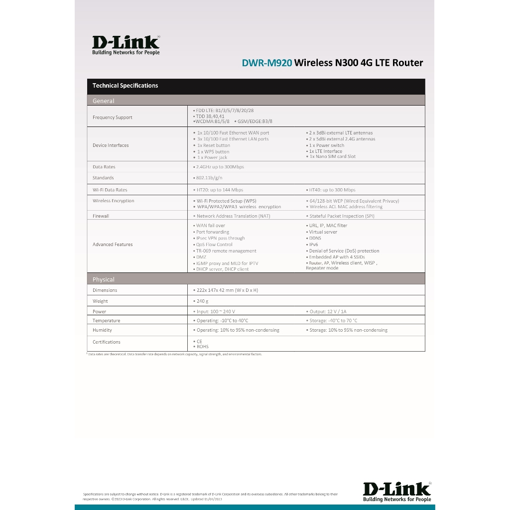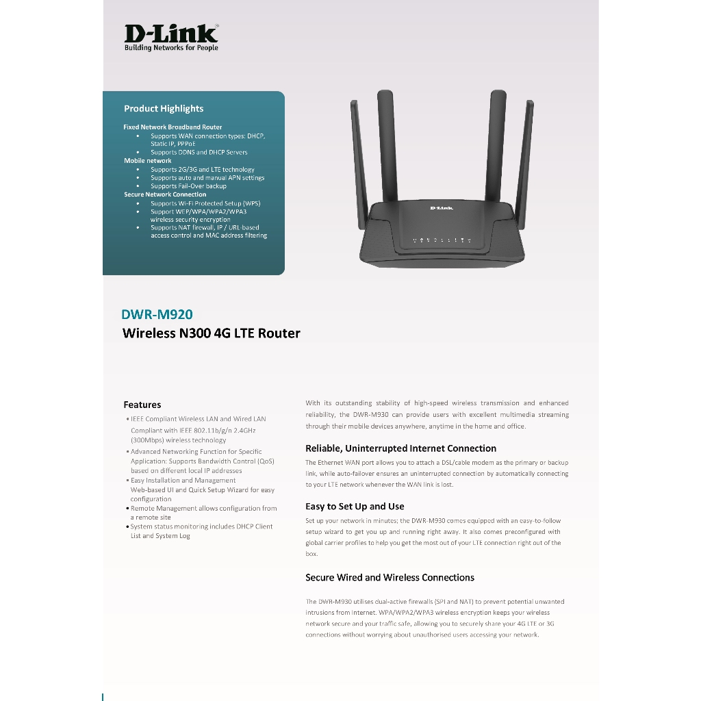 D-Link DWR-M920 Wireless N300 4G LTE VPN WAN Failover Router