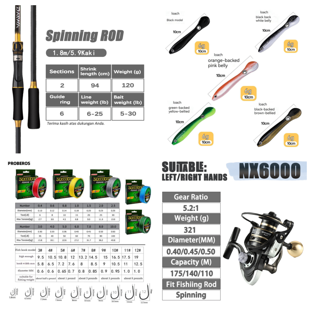 DAIWA Set Pancing 1.8m/2.1m Joran Pancing Umpan Combo pancingan set lengkap Reel Spinning Power Handle Fishing bc murah Kuat Metal Ratio 5.2:1 Lure