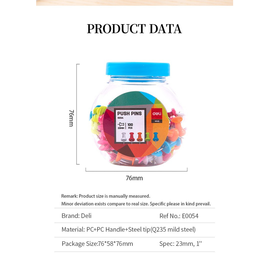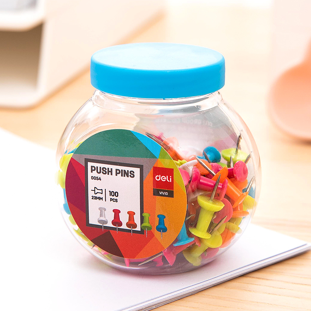 DELI - PIN KERTAS / PIN DINDING / PAKU MADING / PAKU PUSH / THUMBTACK / PUSH PIN COLOUR E0054 TOP ISI 100 PCS