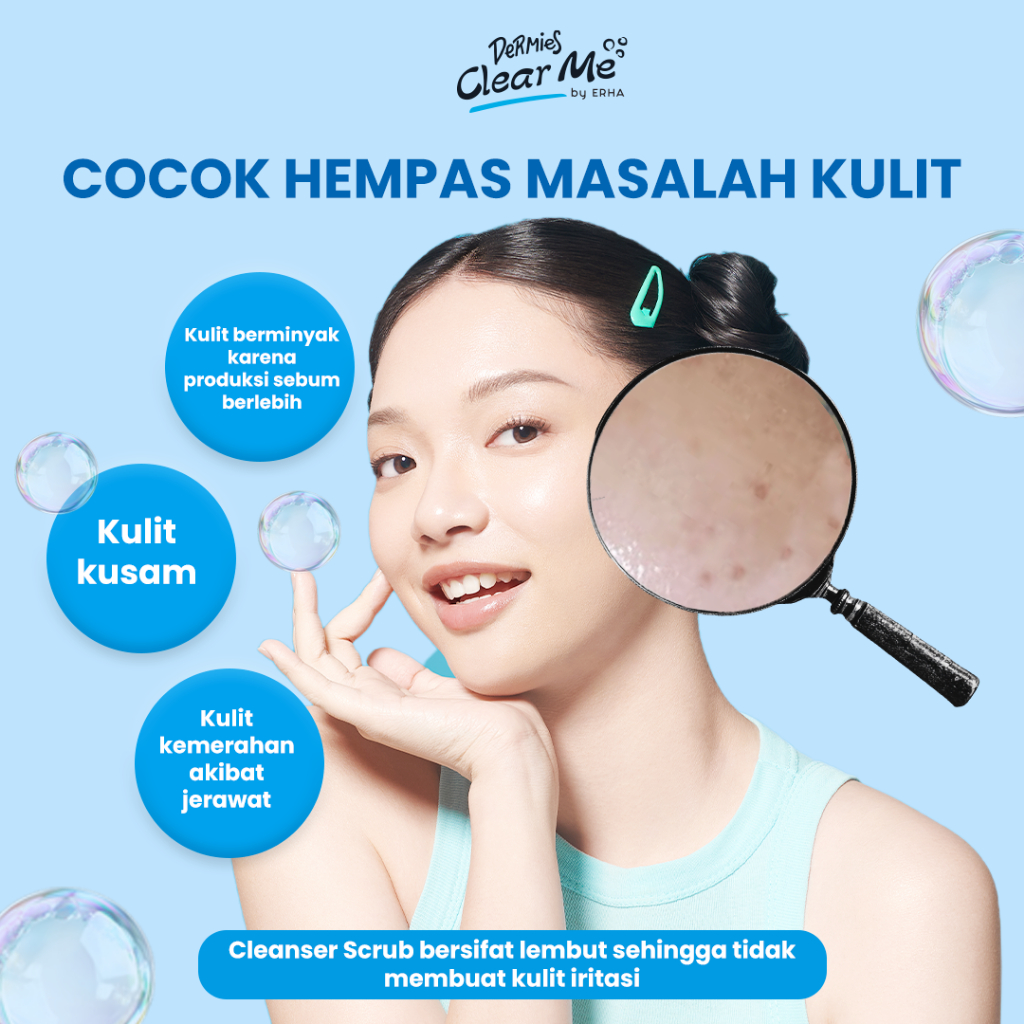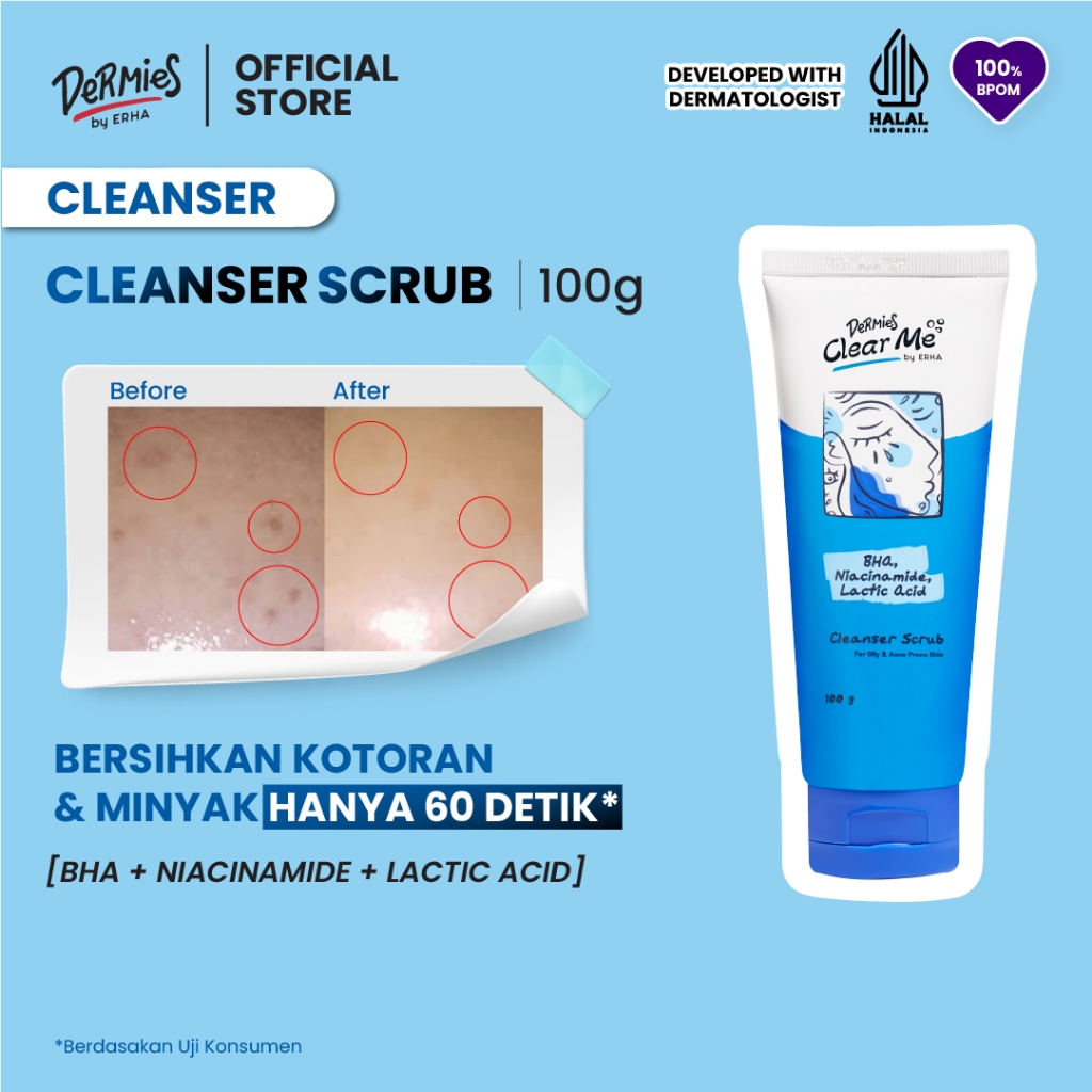 DERMIES Clear Me by ERHA Cleanser Scrub - Sabun Cuci Muka dengan Scrub Lembut untuk Kulit Wajah Anti Jerawat Komedo Minyak Non Alcohol Tanpa Rasa Ketarik 2% Salicylic Acid 100ml