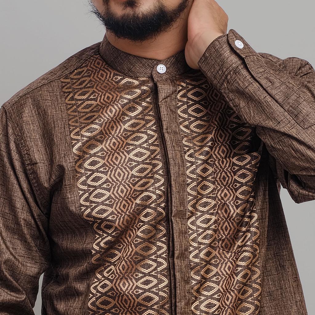 DGM Kemeja Pria Koko Coklat Russet Bordir Lengan Panjang Motif Geometri Lingkaran 2408