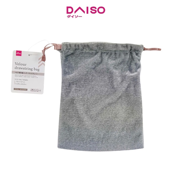 Daiso Velour Drawstring Bag- Simple Text- Light gray-