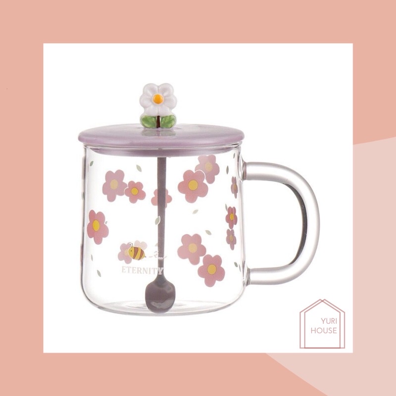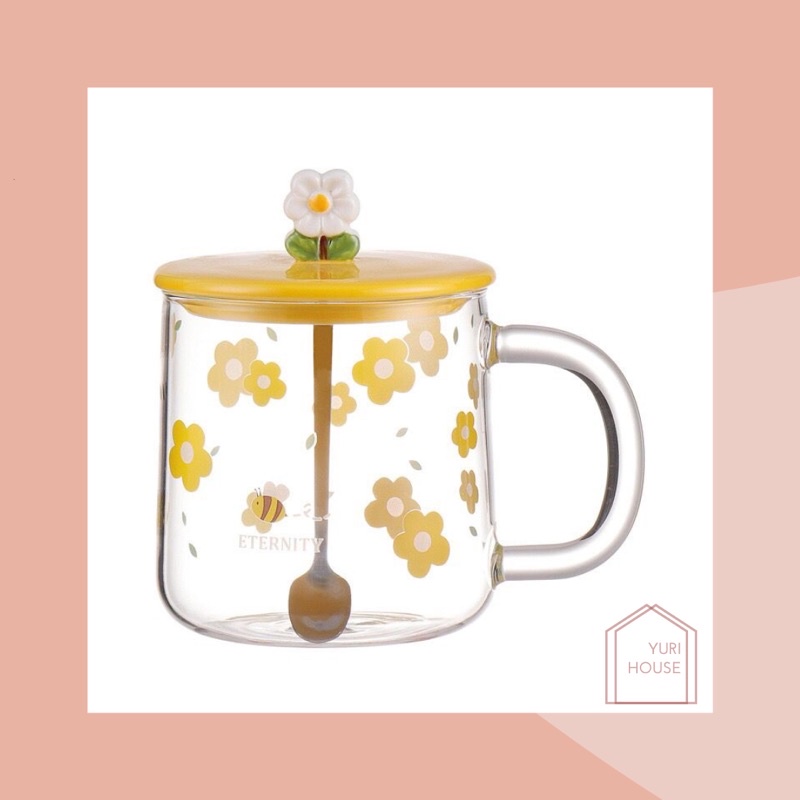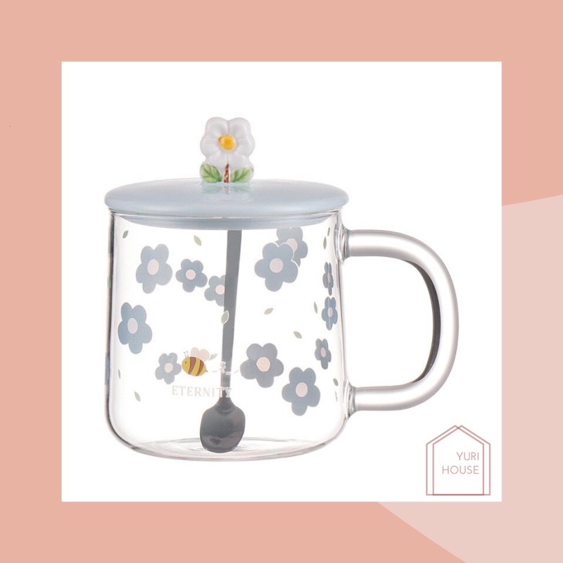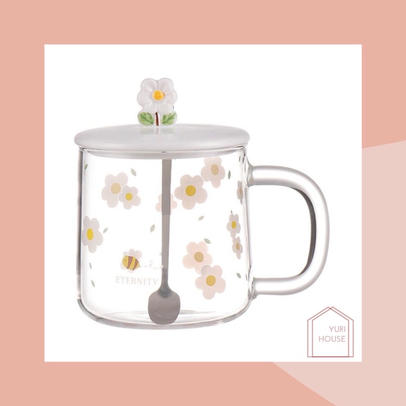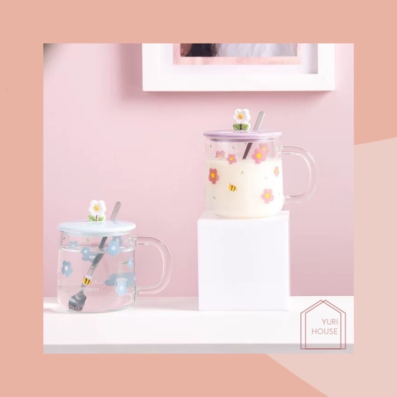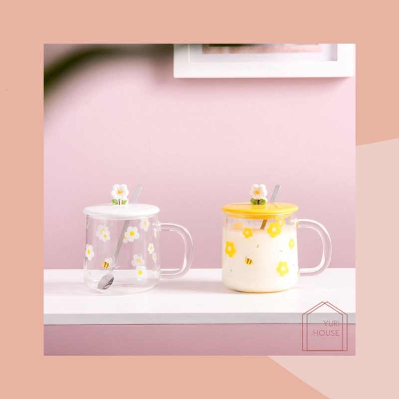 Daisy glass set/ aesthetic daisy glass transparent/ gelas kaca estetik + sendok/ mug kaca warna/ gelas kaca bunga
