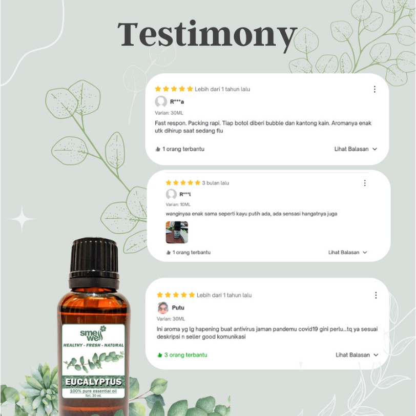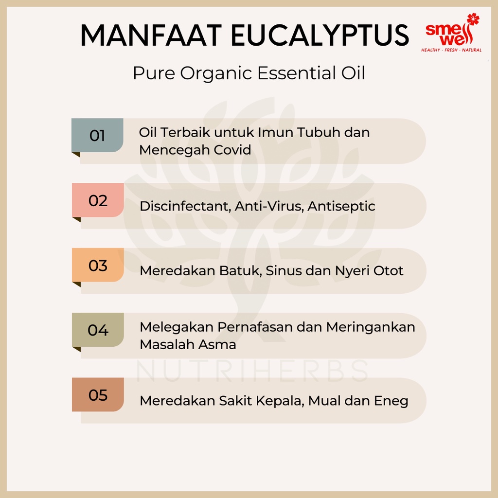 Pure Essential Oil Eucalyptus Minyak Eukaliptus Smellwell Oiled Alami Wangi Murni Organik Pewangi Pengharum Esensial Diffuser Aromaterapi Humidifier Organic Sehat Segar Pernafasan Lega Flu Batuk Pilek Anti Bakteri Alami Relaksasi Tidur Nyenyak Spa Yoga