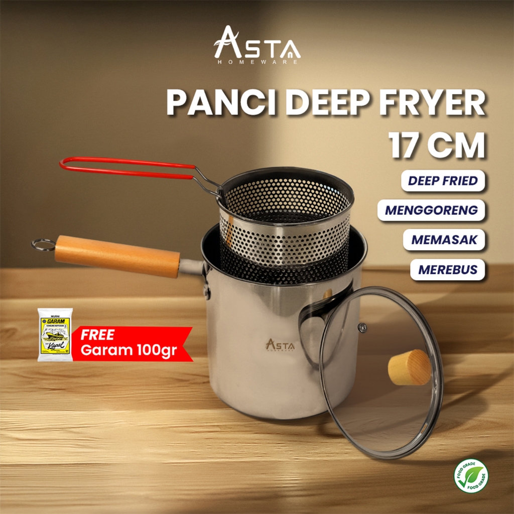 Deep Fryer Stainless Steel - Panci Penggorengan + Saringan - Tebal Tutup Kaca 17 cm | Asta Homeware
