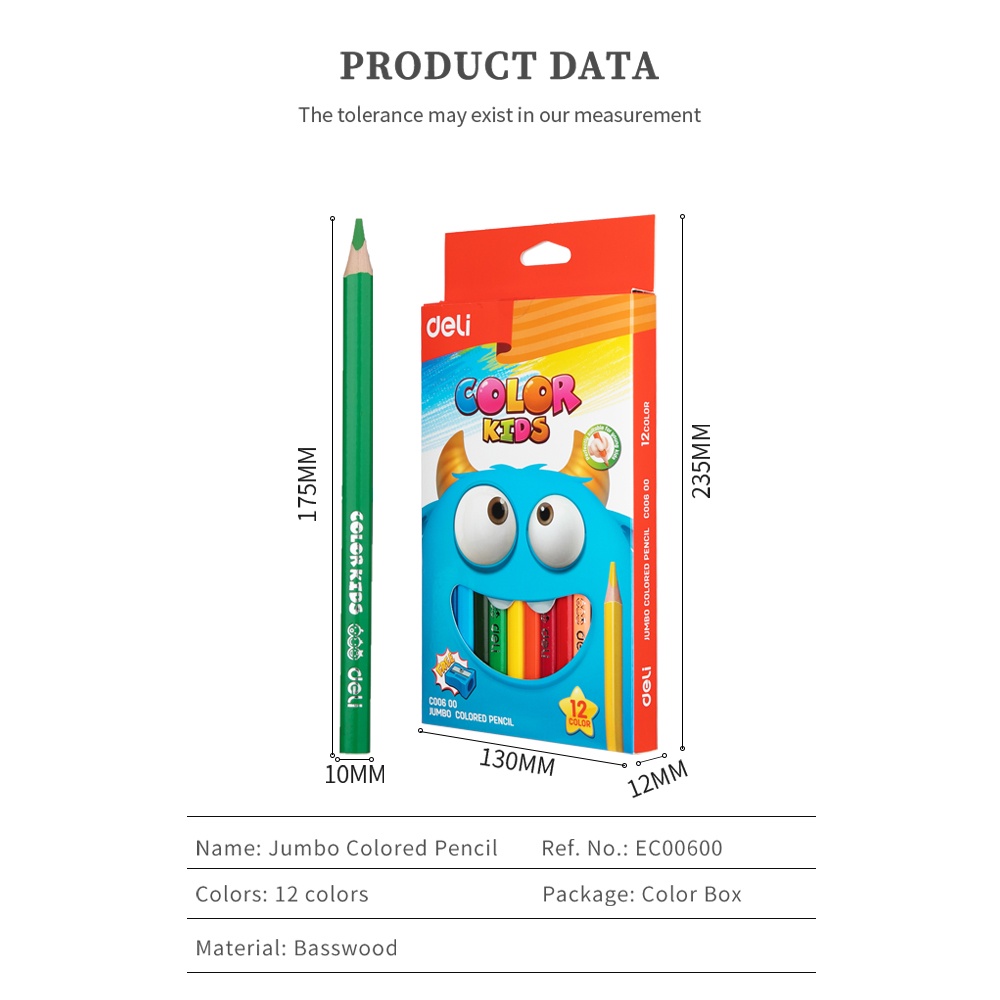 Deli Pensil Warna Jumbo 6/12 warna pewarnaan ekstra halus bentuk ergonomis EC00600