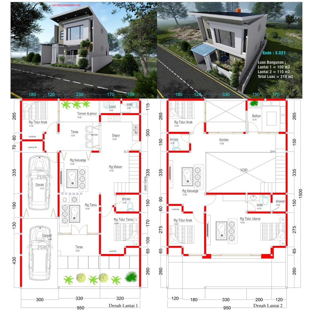 Desain Rumah Minimalis 2 Lantai 9.5x15 Meter 5 Kamar Tidur