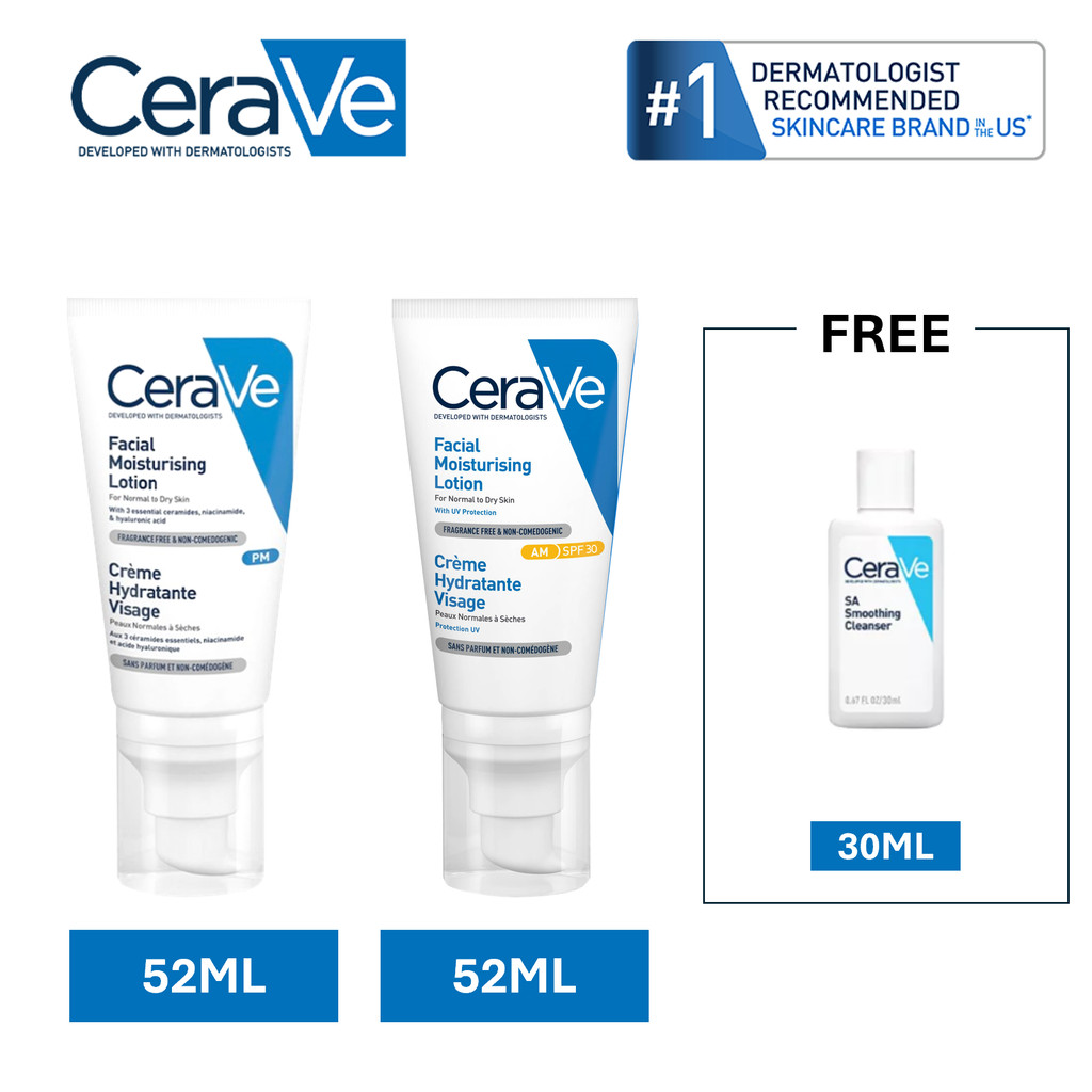 CeraVe AM+PM Ceramide Hydration Duo Day and Night Face Moisturizer (Pelembab Krim Wajah untuk Pagi dengan SPF 30 dan Krim Malam) Free SA Cleanser 30ml