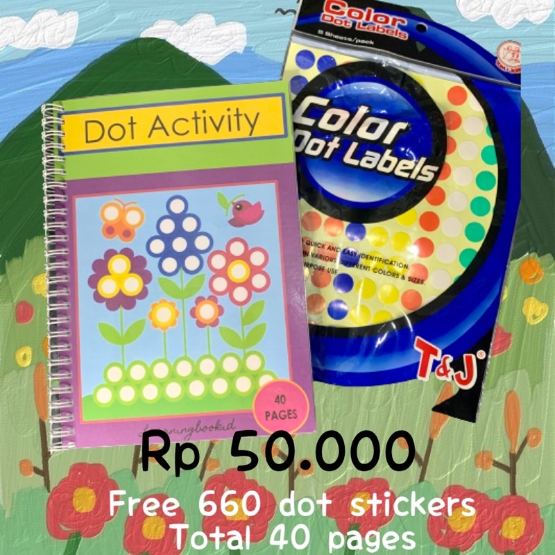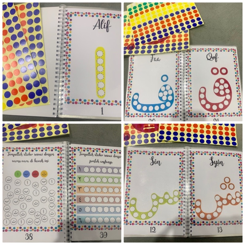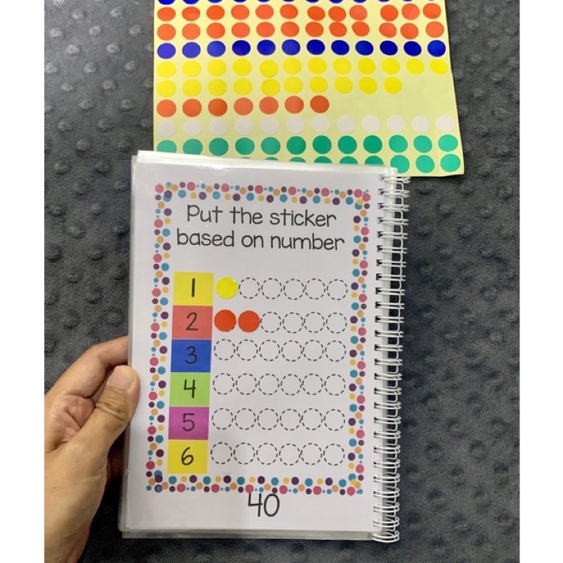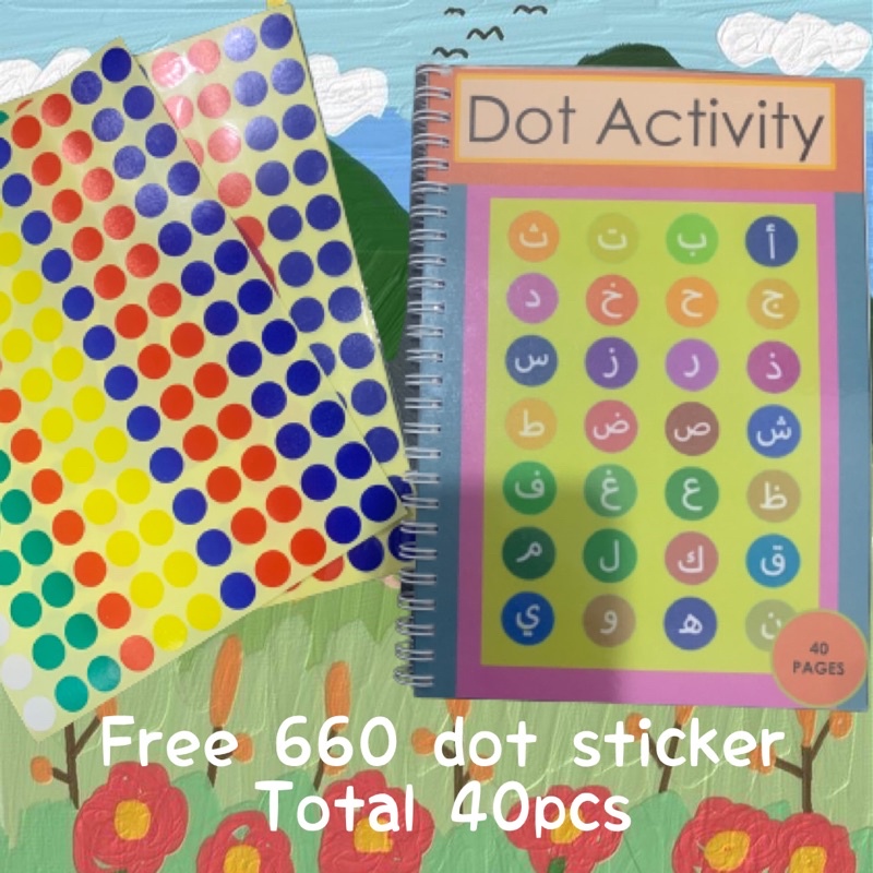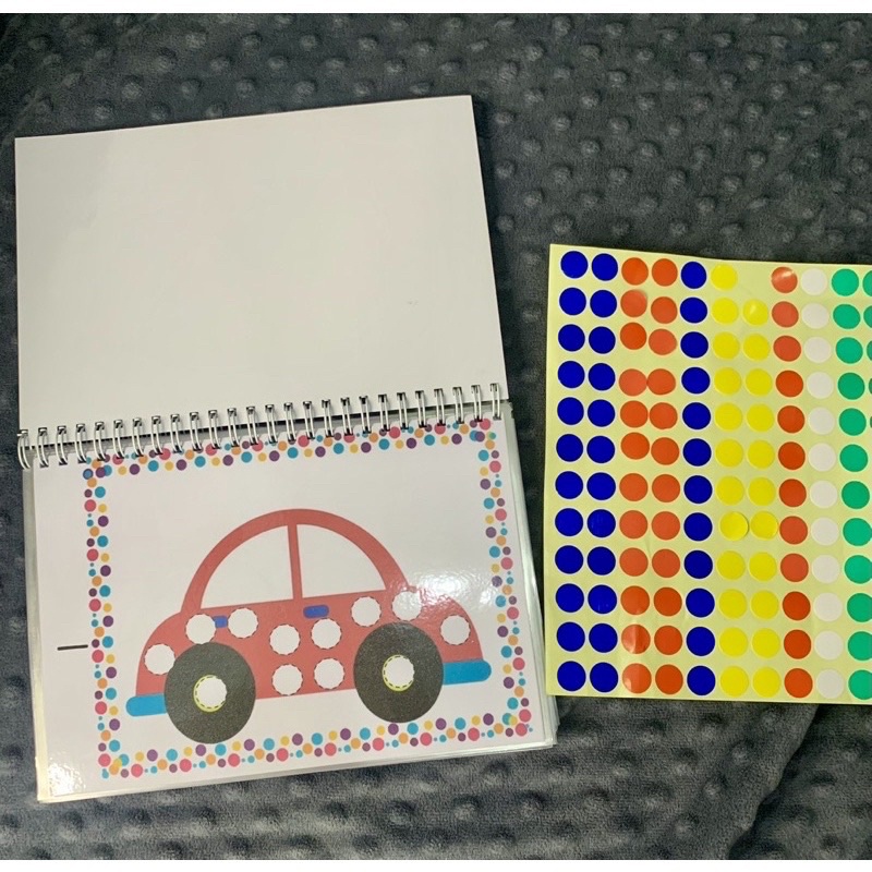 Dot Activity Sticker Worksheet Book 40 pages. Buku aktivitas menempelkan stiker bulat huruf, angka, hewan. Reusable Sticker Dot Activity Set Book Alphabets, Numbers, Animals, Transportations, Vehicles. Mainan Edukasi Anak
