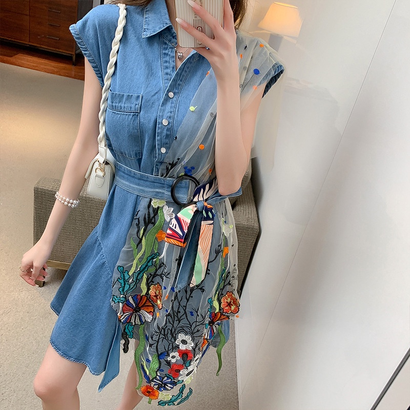 Dress Wanita Denim Korean Style ICONZ Import Kombinasi & Belt (1121/00041)