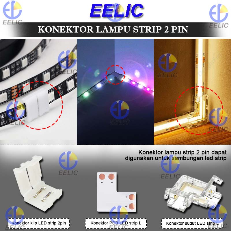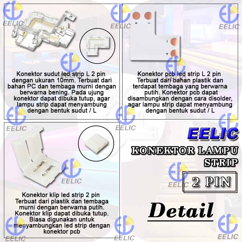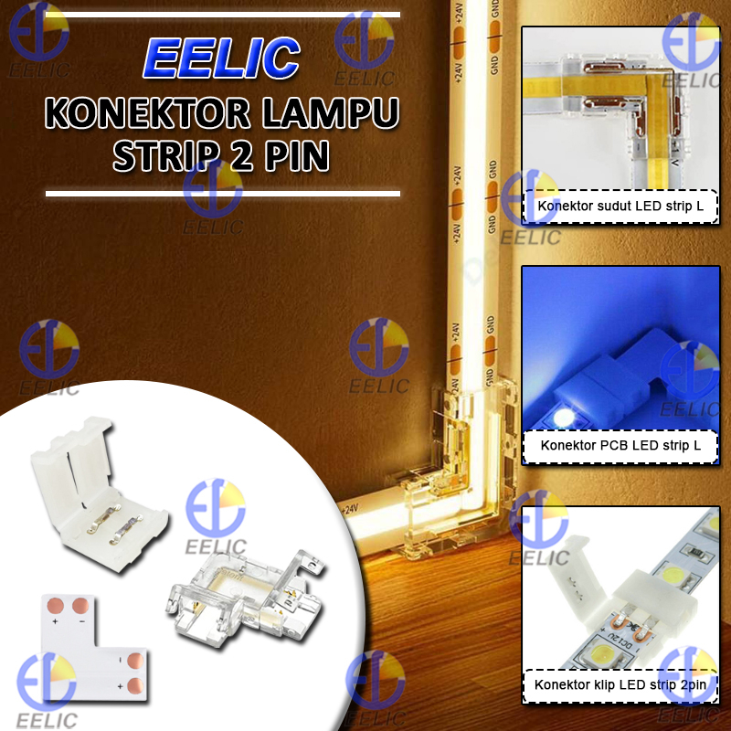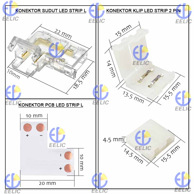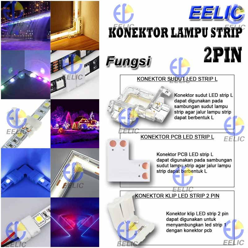 EELIC KLS-10MM/KLS-8MM Konektor lampu strip 2 pin terdapat konektor sudut led strip L, konektor pcb led strip L, konektor klip led strip 2 pin digunakan untuk penyambung lampu strip 2 pin dengan pilihan ukuran 8mm dan 10mm