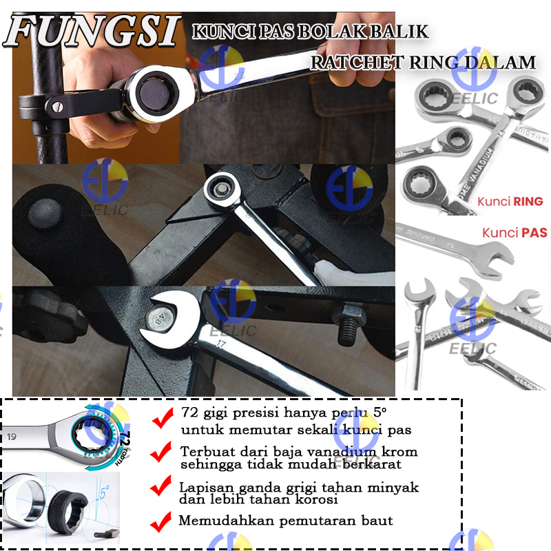 EELIC KUP-RINGRD Kunci pas ring kombinasi ratchet Bolak-Balik wrench Besi Baja vanadium krom chrome ukuran 8mm,10mm,12mm ,13mm, 14mm,16mm,17mm,18mm,19mm,22mm,24mm,27mm