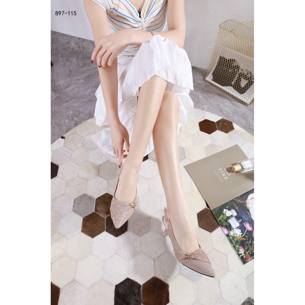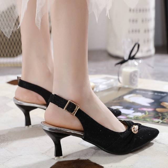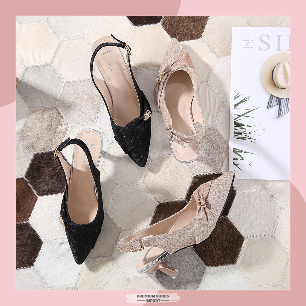 ELLORA 897-115 Sepatu Pesta Wanita Heels Kitten 5cm Slingback Gesper Bahan Kanvas Glitter Import